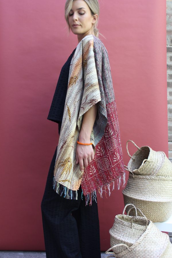 52,00 €Il prezzo originale era: 52,00 €.36,40 €Il prezzo attuale è: 36,40 €.Mantella con taglio scialle e frange alla base. Lavorazione a patchwork con tessuti in seta da sari riciclati e ricamo Khanta. Colori e disegni assortiti, ogni pezzo è unico. Altezza modellla: 1,73 e indossa taglia unica Cura prodotto: Lavaggio a mano temperatura massima 30°, detergere il capo con un detersivo […]