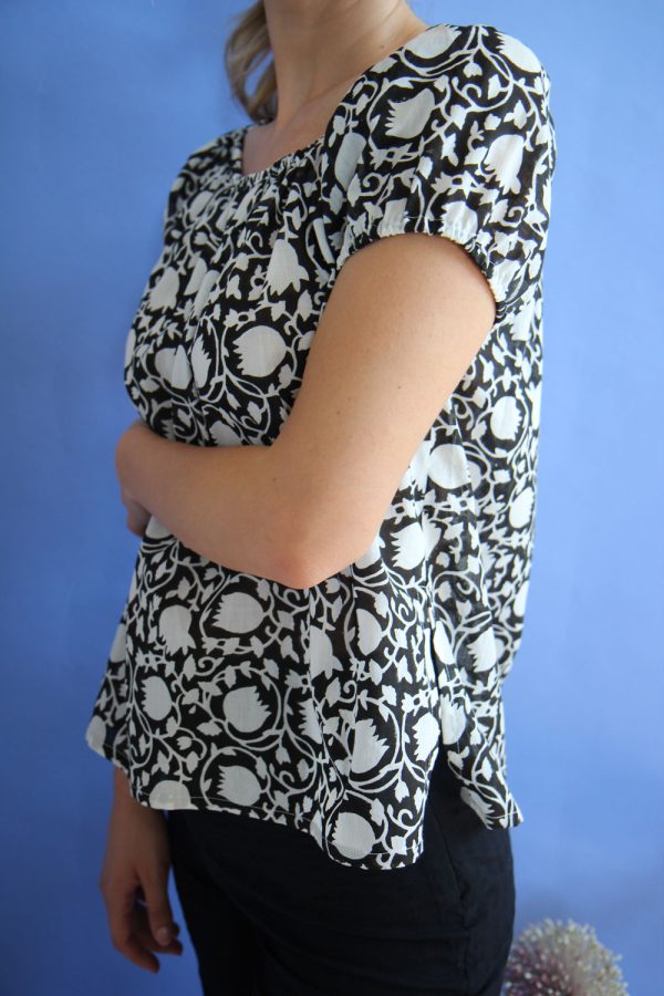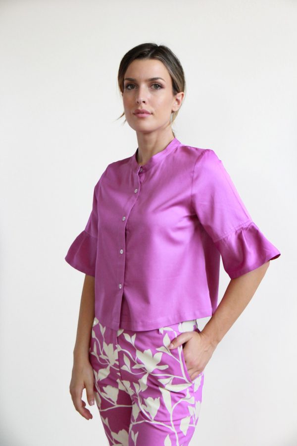 42,00 €Blusa crpped a maniche corte in cotone leggerissimo con stampa a mano block print. Scollo ampio e arricciato davanti e dietro. Il dettaglio delle maniche a palloncino unito alla linea morbida e ariosa, arricchita dai due spacchi al fondo, donano al capo un look particolarmente femminile e vivace. Altezza modellla: […]