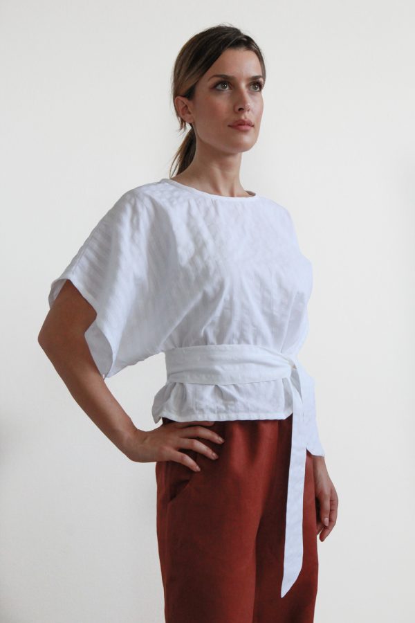 48,00 €Blusa cropped ampia con fascia in cintura in cotone seersucker. Modello caratterizzato da scollo tondo e dalla manica corta con taglio a kimono, che rende il capo originale dal gusto orientale. Altra particolarità del capo è la cintura, dello stesso materiale, fissata sul retro della blusa. Questo accessorio incorporato permette […]