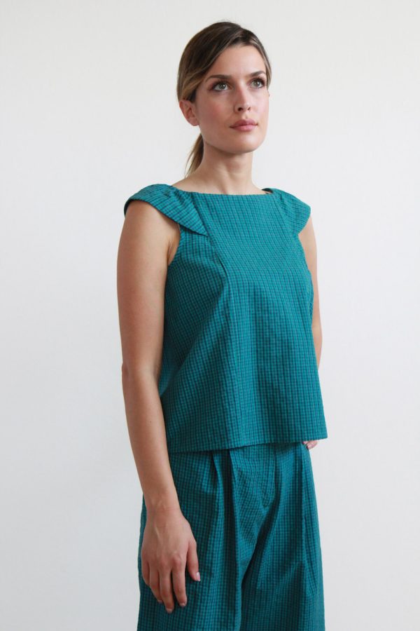 45,00 €Top smanicato corto in cotone seersucker a scacchi. Modello caratterizzato da una linea dritta con riprese sia davanti che dietro assorbite da due tagli longitudinali e impreziosito dal dettaglio dei due volant sulle spalle a coprire leggermente. Altezza modellla: 1,73 e indossa taglia S Cura prodotto: Lavaggio a mano o […]