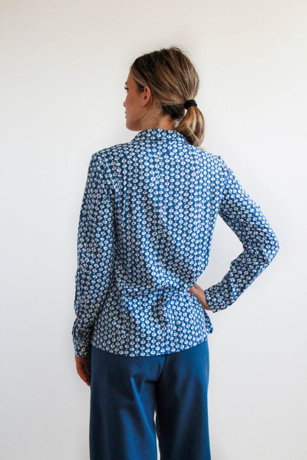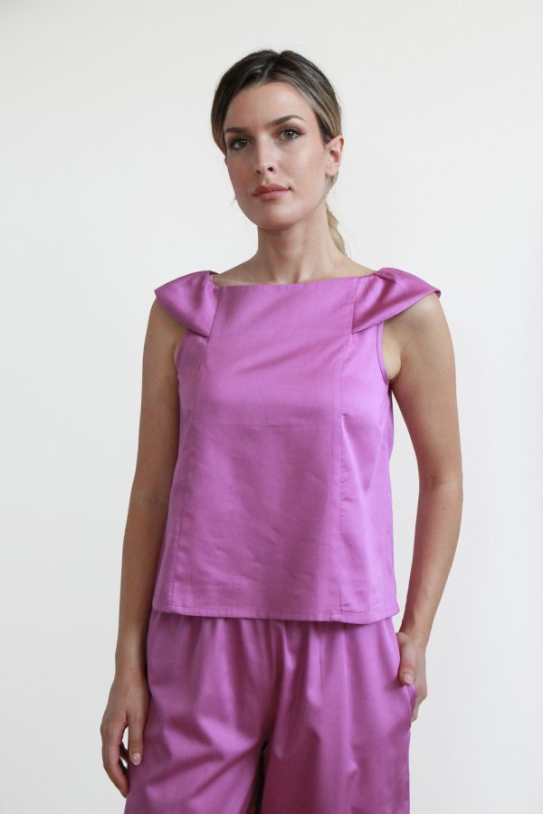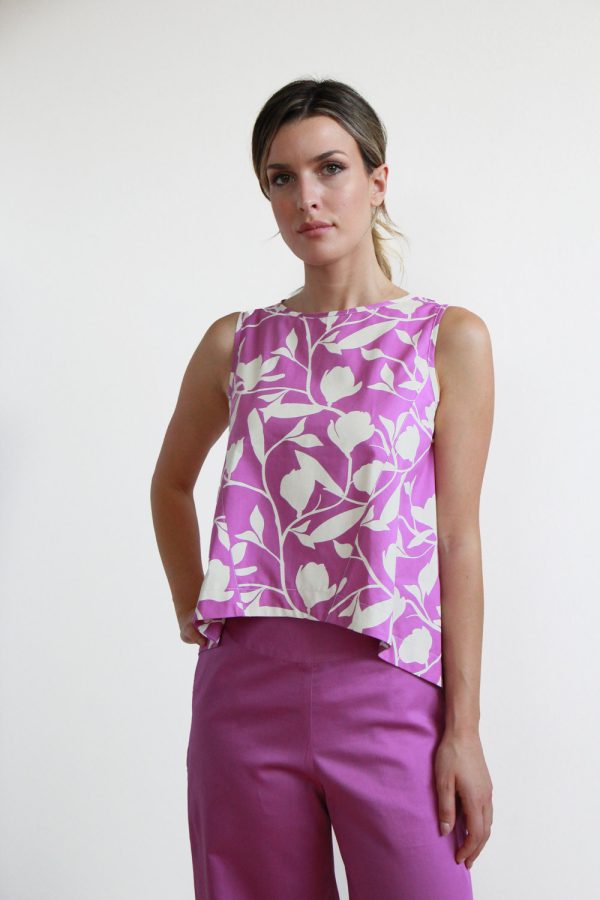 54,00 €Top smanicato in popeline di cotone stampato over all. Vestibilità regolare e linea svasata con il fondo del retro più lungo del davanti e arrotondato. Scollatura tonda, apertura sul retro con bottoncino in mafreperla e due tagli obliqui sul fronte a partire dal giromanica. Altezza modellla: 1,73 e indossa taglia […]