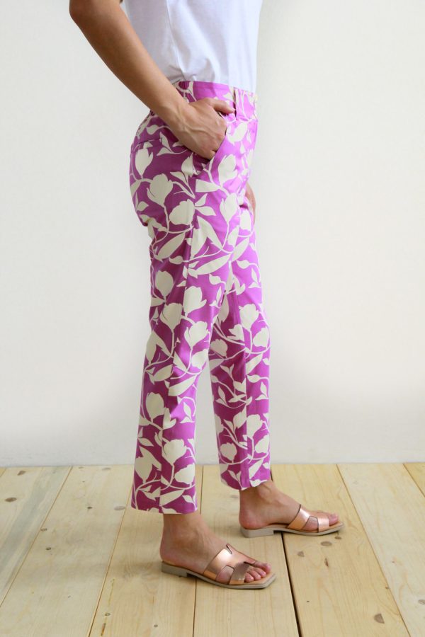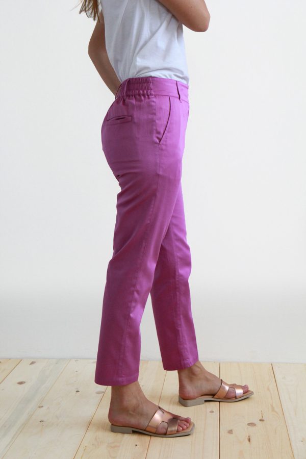 84,00 €Pantalone a sigaretta in cotone satin. La vita con passanti è regolare sul davanti, chiusura a zip coperta e doppio bottone in madreperla. La banda elastica posta sul retro li rende comodi e pratici ad ogni occasione. Questo capo infine è rifinito con tasche alla francese sul davanti e due […]