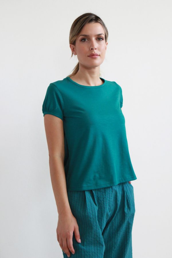35,00 €T-shirt in morbido jersey di cotone biologico certificato GOTS elasticizzato. Modello a maniche corte e girocollo, con taglio raglan, caratterizzato da una linea di cucitura che parte dal collo e si estende diagonalmente fino al fondo della manica. Questo design dona un look sportivo e contemporaneo, valorizzando la linea delle […]