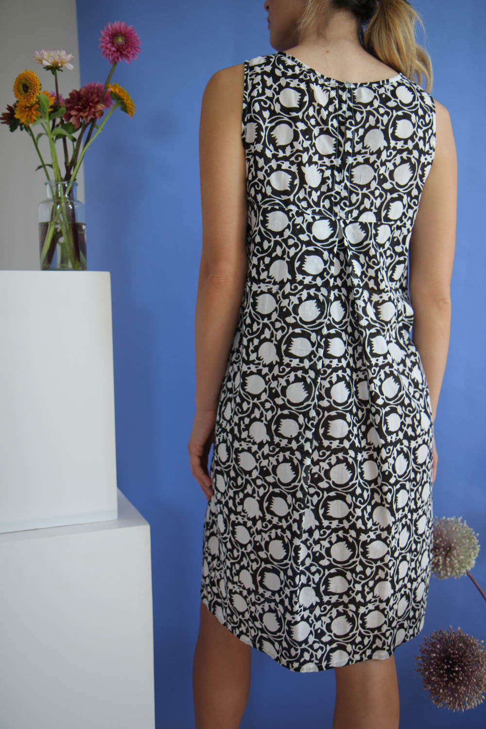 Abito smanicato corto in cotone leggero con stampa a mano block print. Modello a trapezio caratterizzato da una ampia piega sul dietro. Apertura sul retro con bottoncino in cocco.