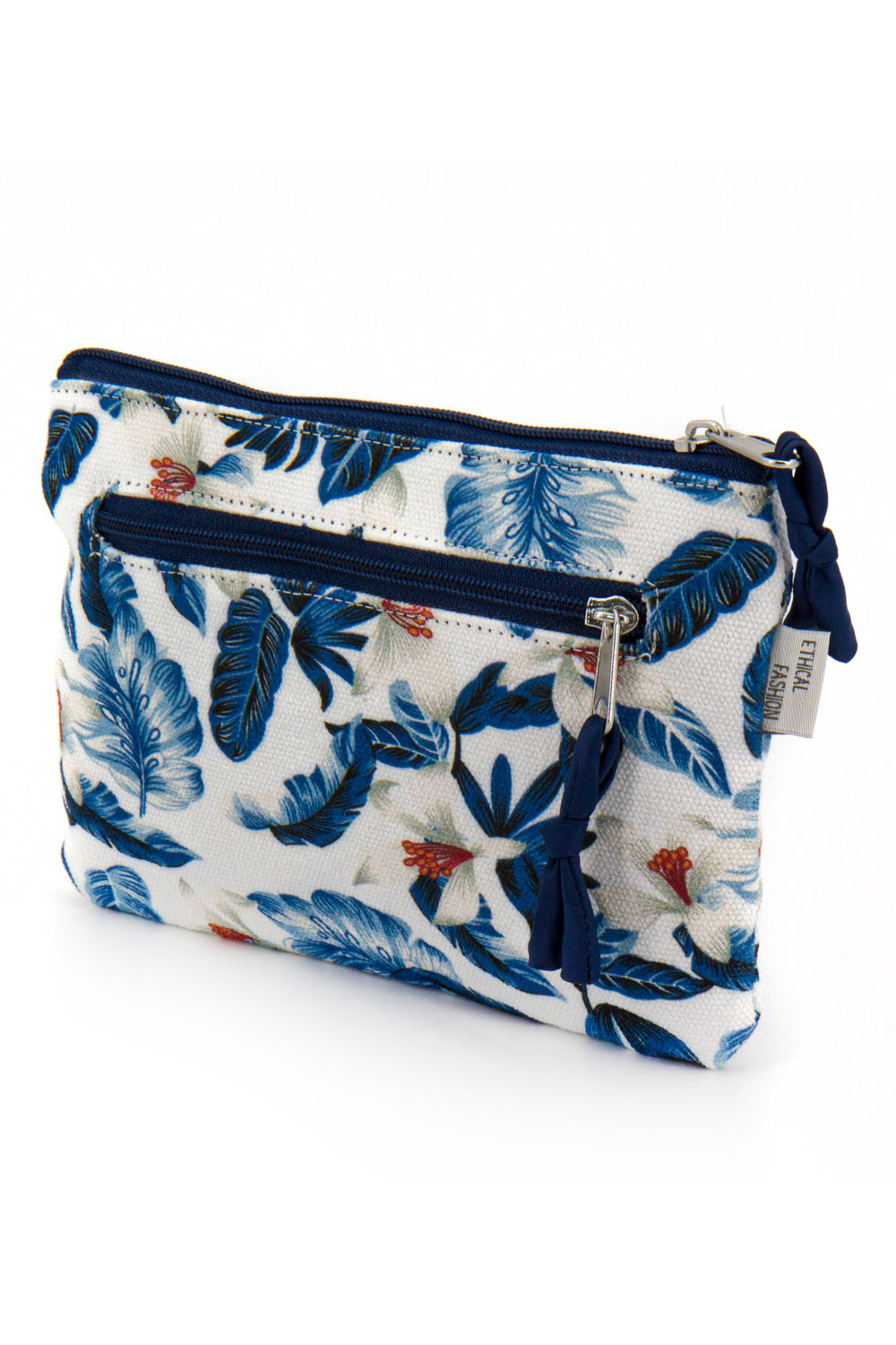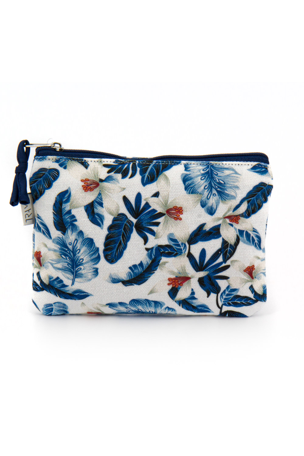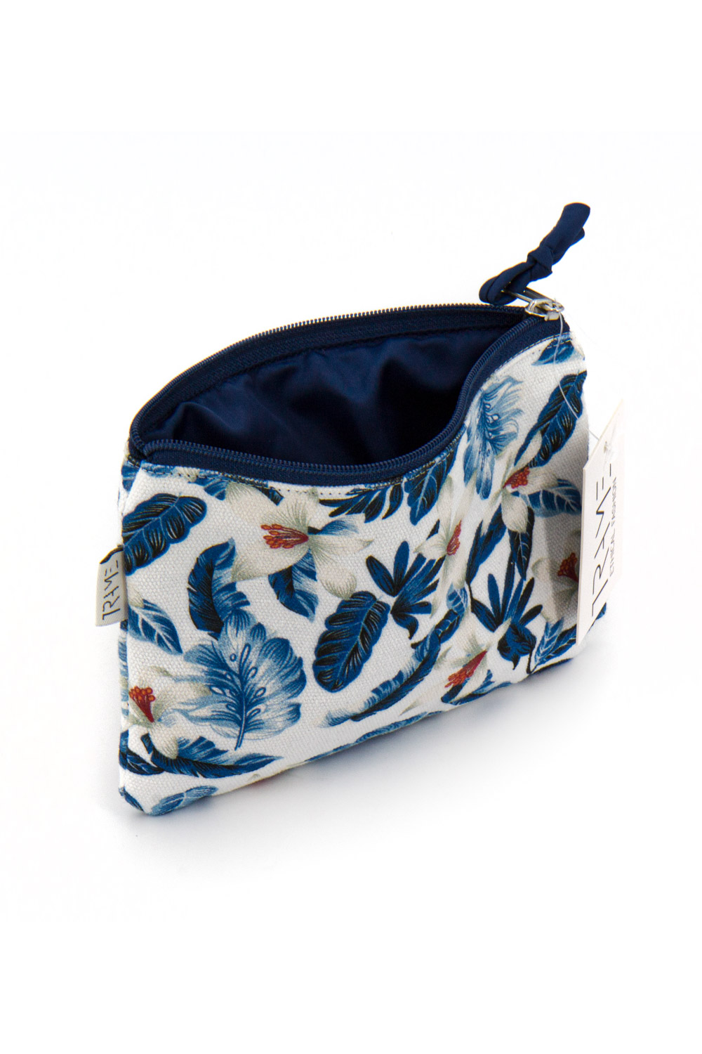 Astuccio in cotone canvas stampato su colore base blu cobalto. Chiusura con zip. Interno foderato. Tasca posteriore con zip.