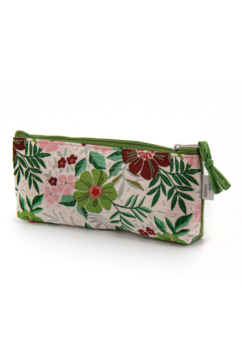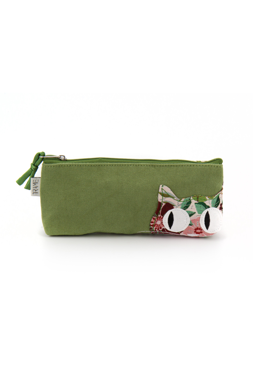 Astuccio portapenne in cotone canvas colore verde e applicazione frontale gatto in cotone broccato con fantasia floreale. Retro in cotone broccato con fantasia floreale. Chiusura con zip. Interno foderato.