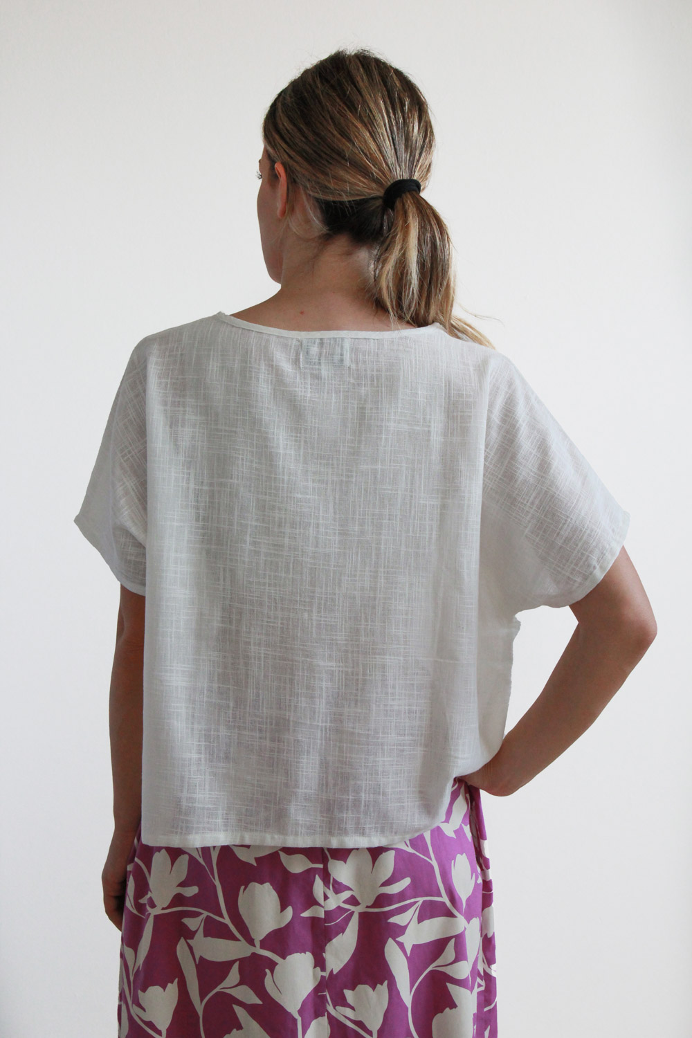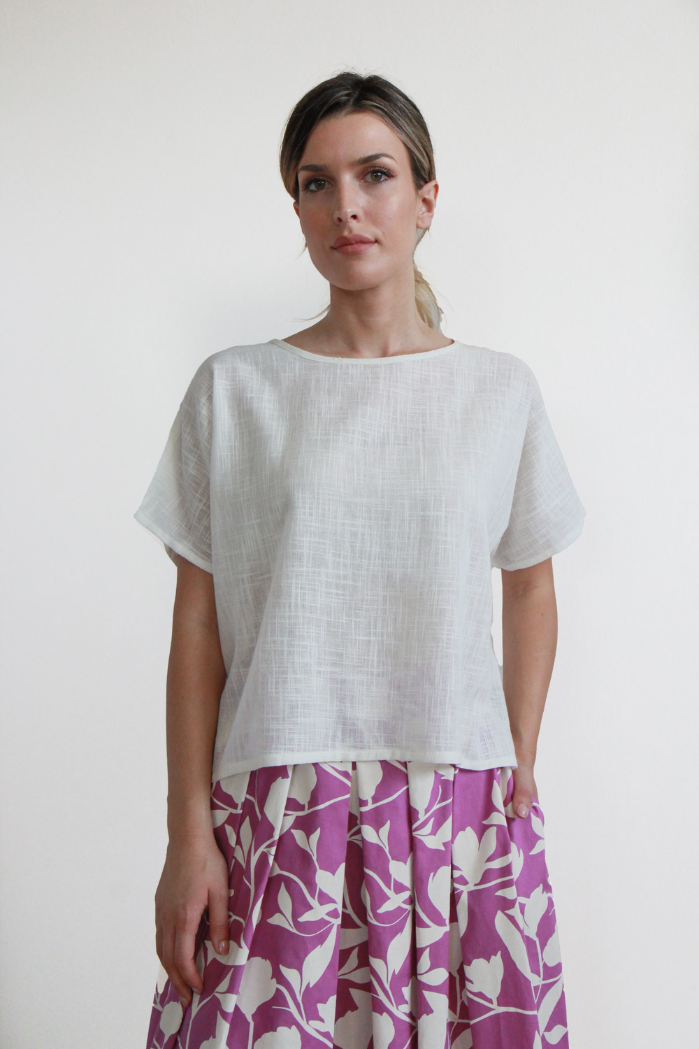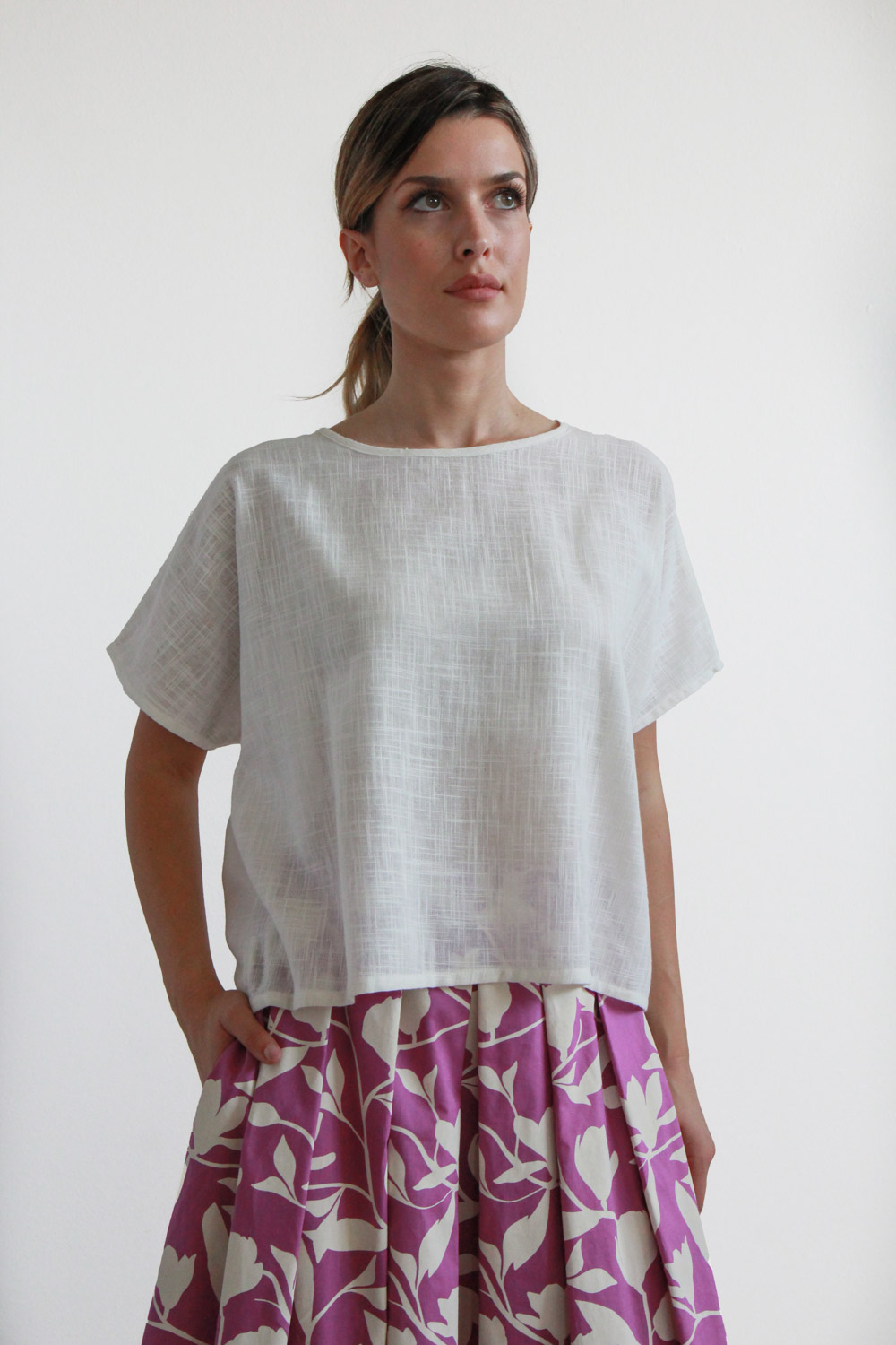 Blusa corta in cotone garzato leggerissimo. Linea dritta e ampia, maniche corte con taglio a kimomo e collo ampio a giro.