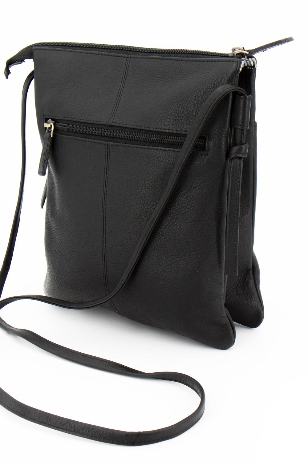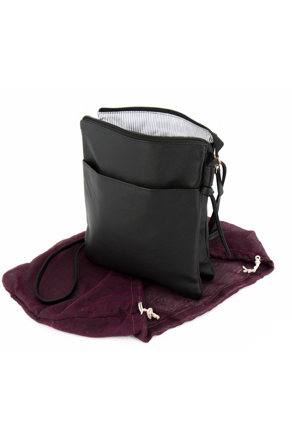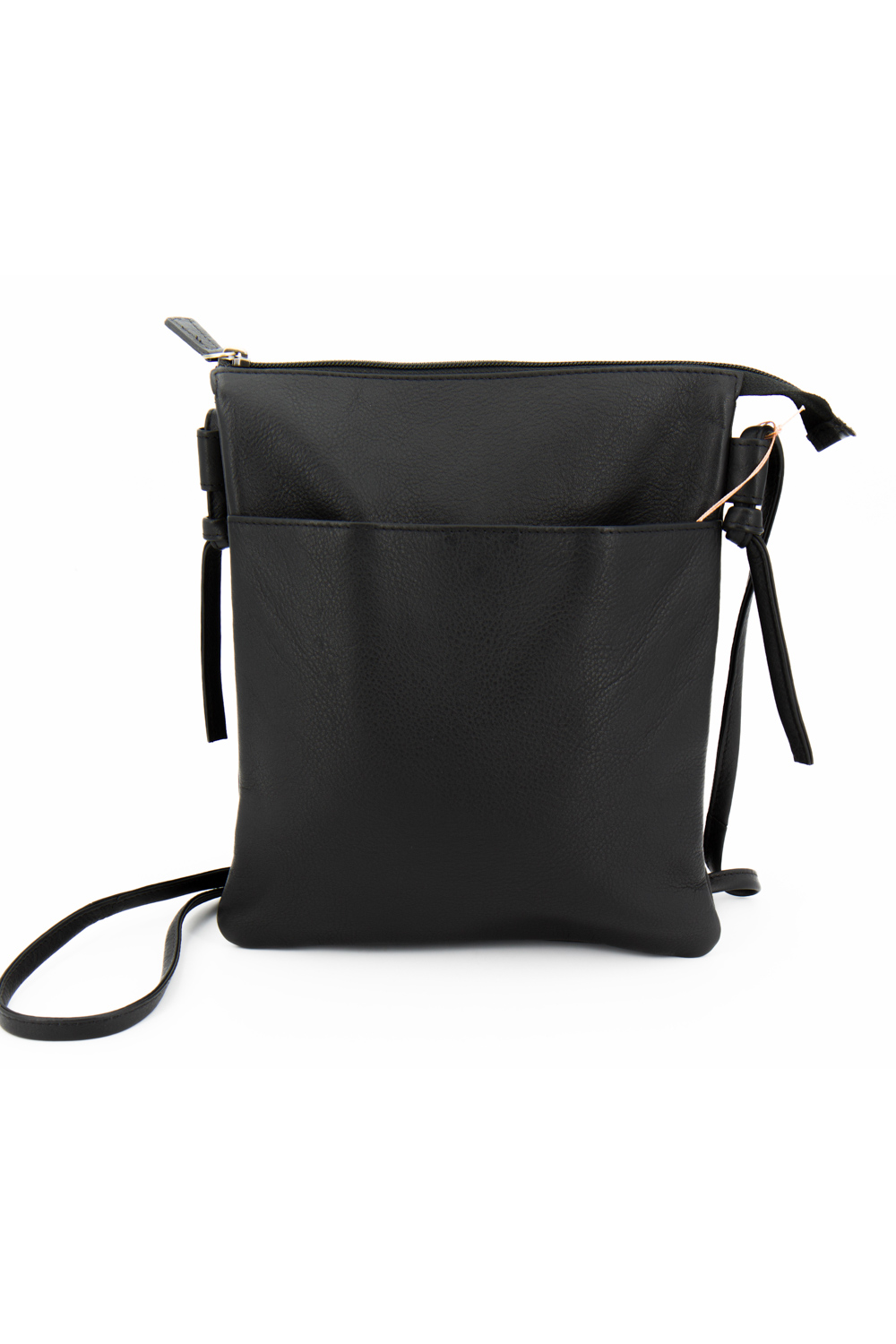 Borsa a tracolla media in morbida nappa bovina con chiusura a zip. Tasca piatta esterna con zip ed una con bottone magnetico. Tracolla semi-regolabile con nodi. Interno foderato in cotone a righe con due comparti definiti, tasca piccola con zip ed una senza.