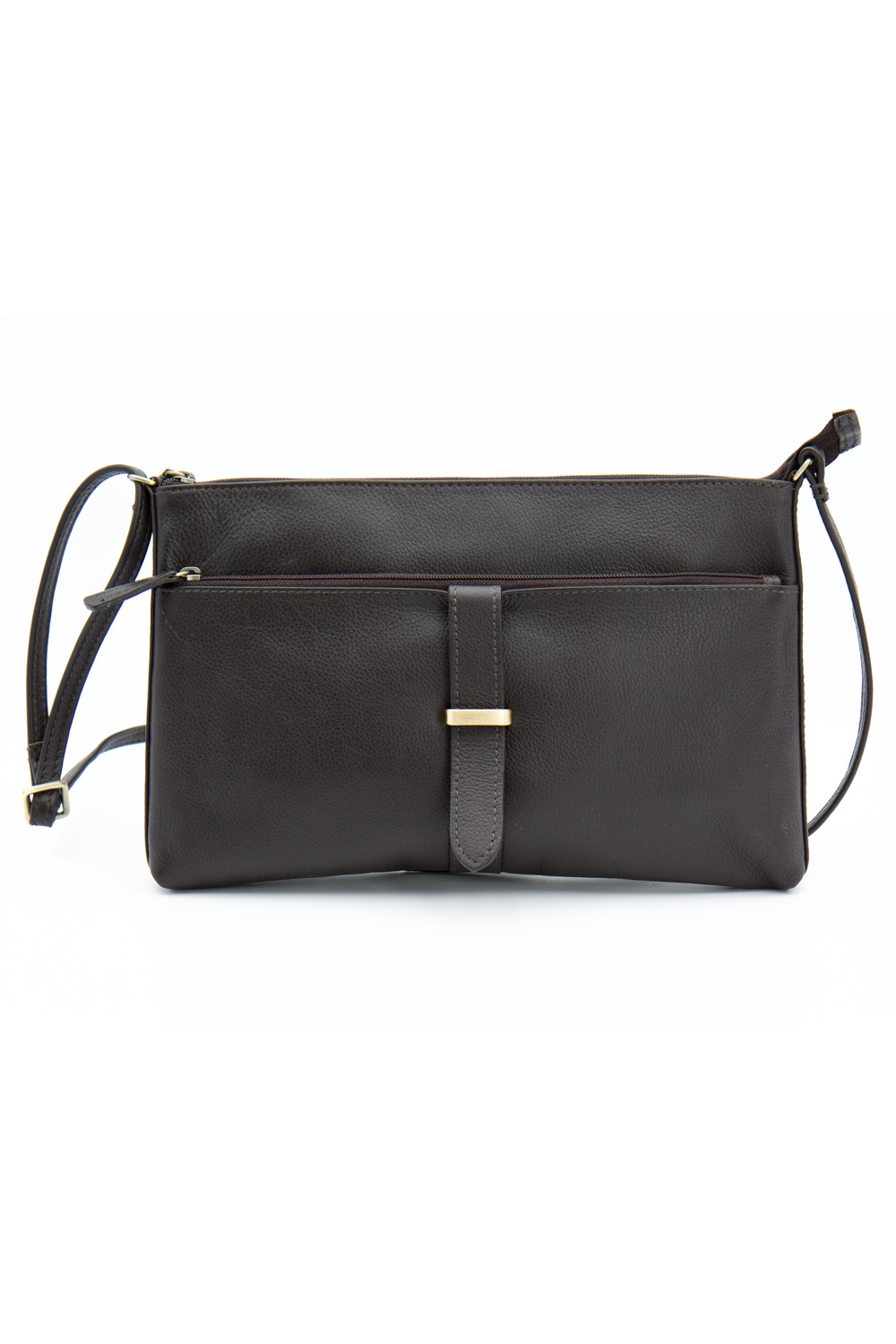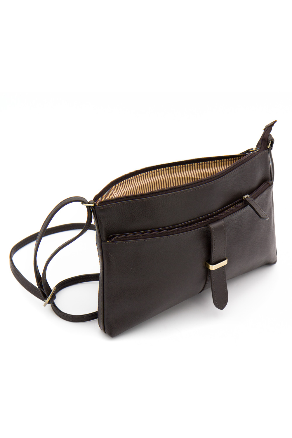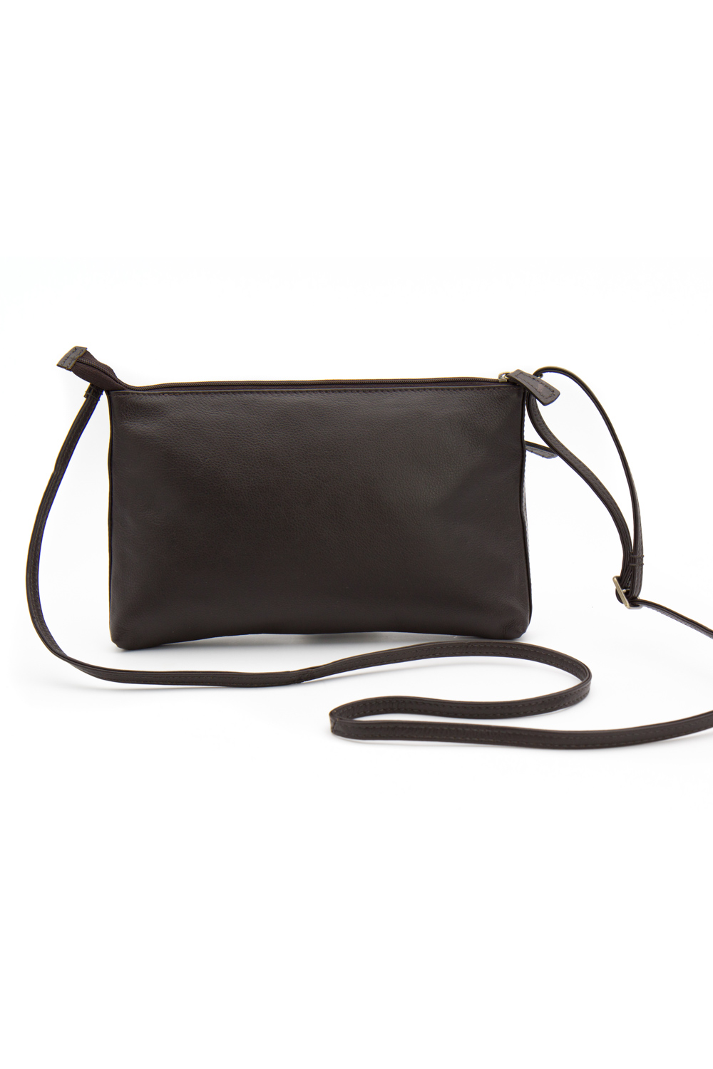 Borsa a tracolla piccola dalla forma rettangolare in morbida nappa bovina. Chiusura a zip. Tasca piatta con zip sul davanti, rifinita da un cinturino esterno. Tracolla regolabile. Interno foderato in cotone a righe con due comparti definiti, tasca piccola con zip ed una senza.
