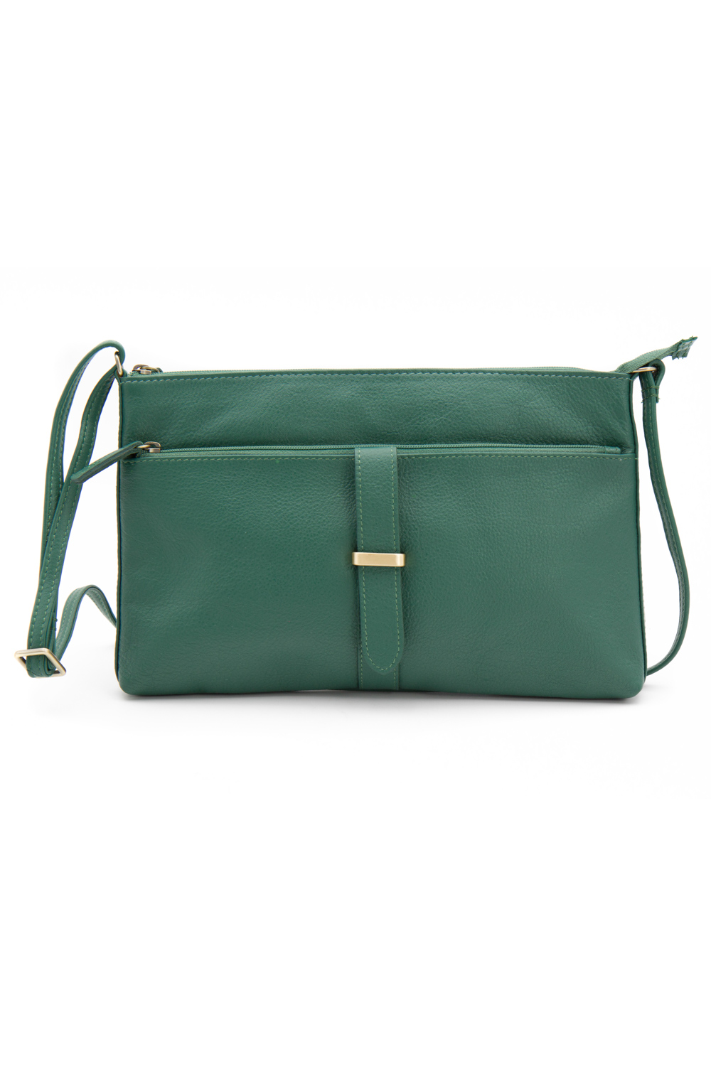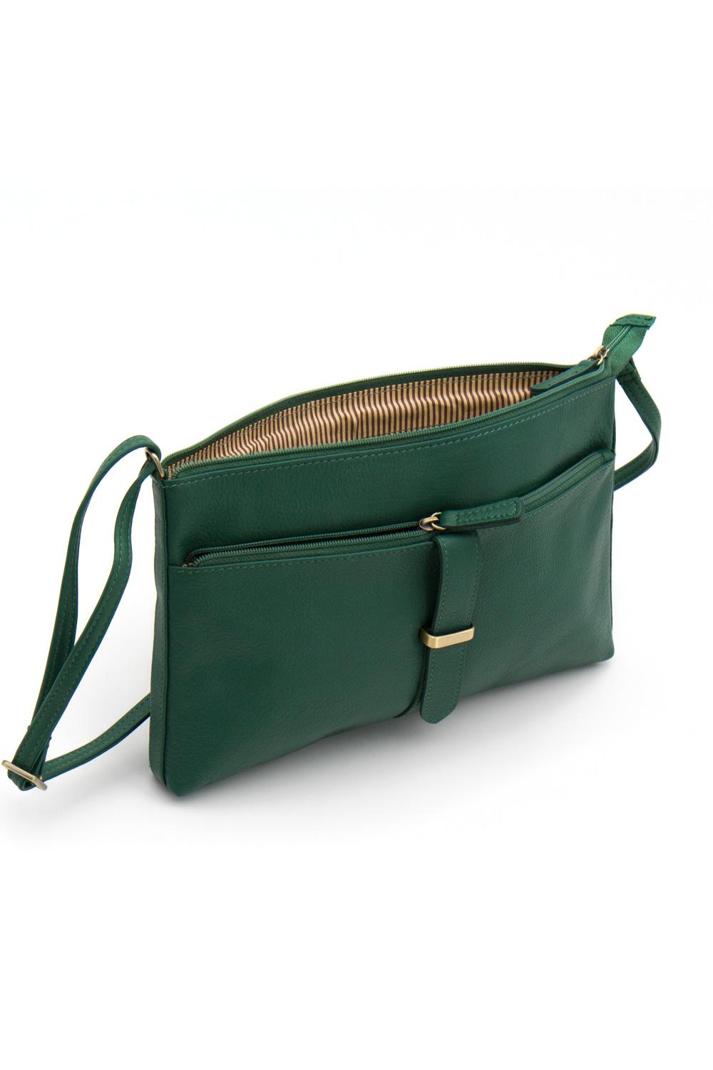 Borsa a tracolla piccola dalla forma rettangolare in morbida nappa bovina. Chiusura a zip. Tasca piatta con zip sul davanti, rifinita da un cinturino esterno. Tracolla regolabile. Interno foderato in cotone a righe con due comparti definiti, tasca piccola con zip ed una senza.