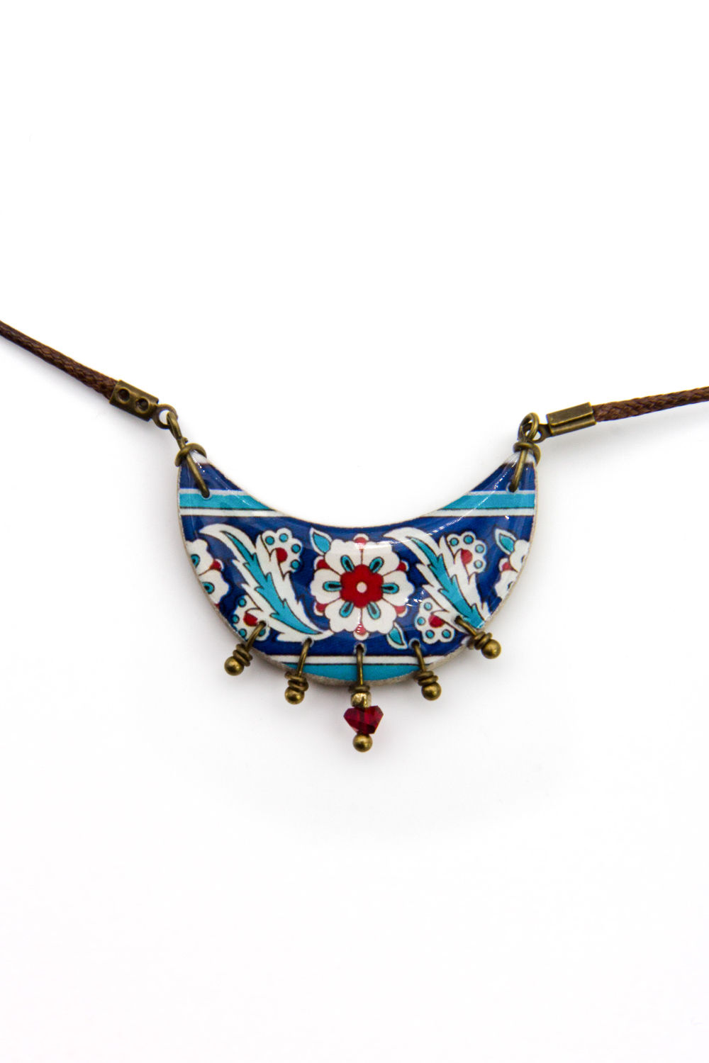 Collana con ciondolo a forma di mezzaluna in ceramica a freddo decorata su un sottile cordino di cotone cerato regolabile con nodo scorrevole. Piccole perline in bronzo anticato e vetro arricchiscono e illuminano il ciondolo.