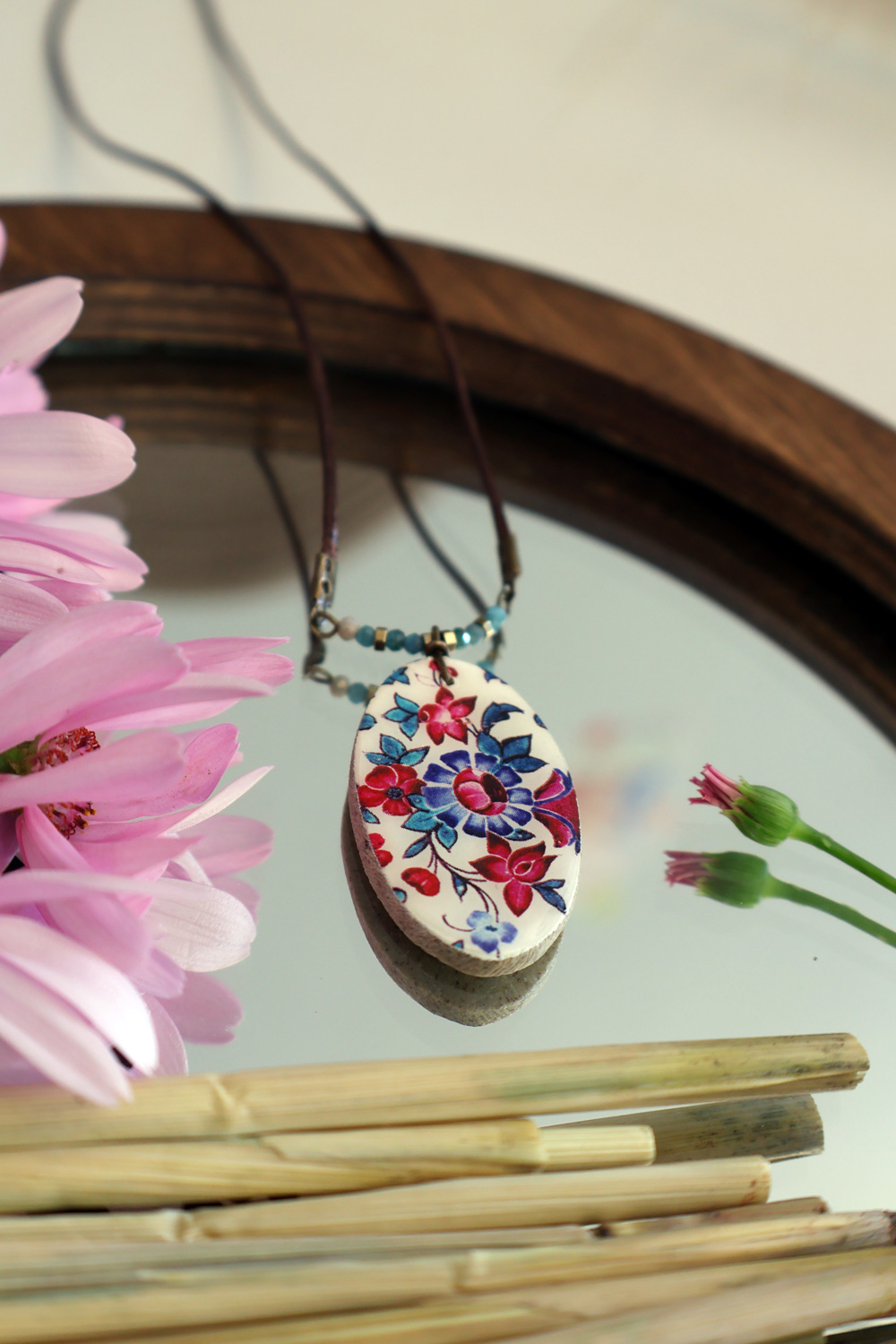 Collana con ciondolo a forma di ovale in ceramica a freddo decorata su un sottile cordino di cotone cerato regolabilecon nodo scorrevole. Piccole perline di vetro arricchiscono e illuminano il ciondolo. L’elemento in ceramica è decorato con motivi geometrici colorati ispirati ai patterns delle antiche maioliche delle architetture islamiche-persiane; ogni fase è realizzata interamente a mano. Il fascino della tradizione si unisce ad una artigianalità innovativa creando pezzi unici raffinati e senza tempo.