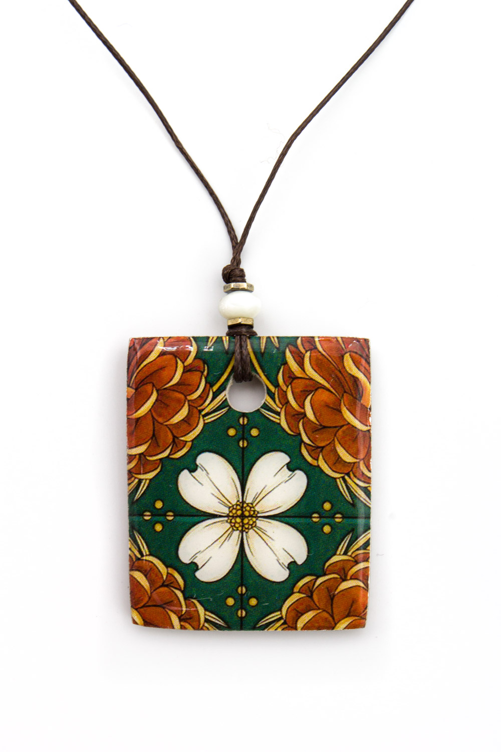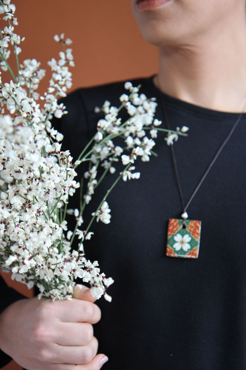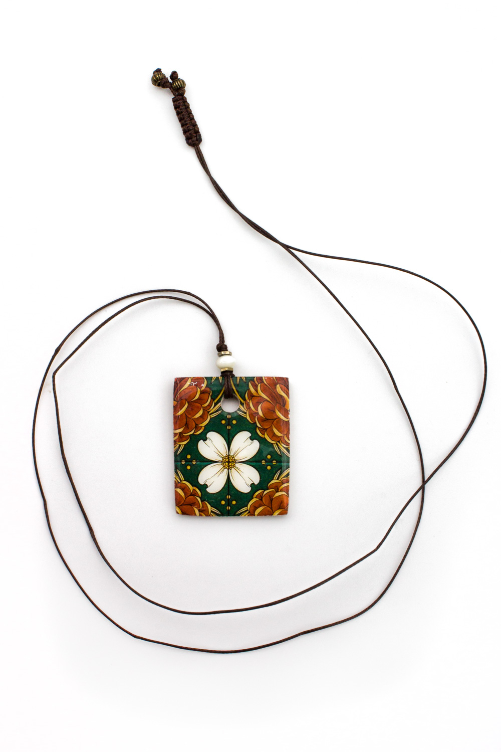 Collana con ciondolo a forma di rettangolo in ceramica a freddo decorata su un sottile cordino di cotone cerato regolabile con nodo scorrevole. Piccola perlina di vetro illumina il ciondolo.
