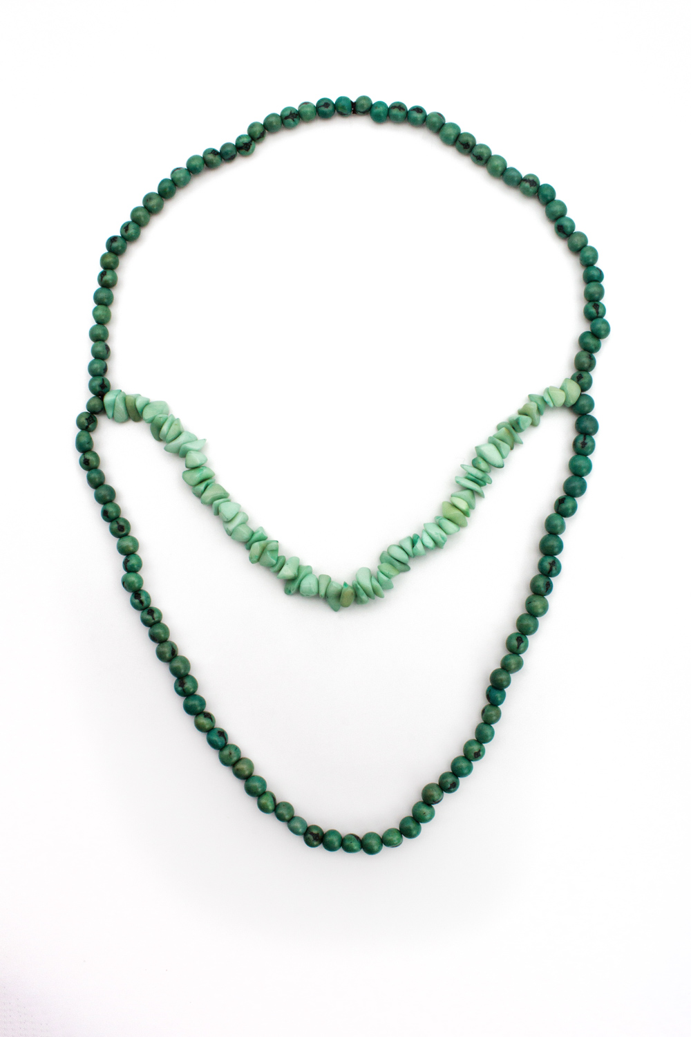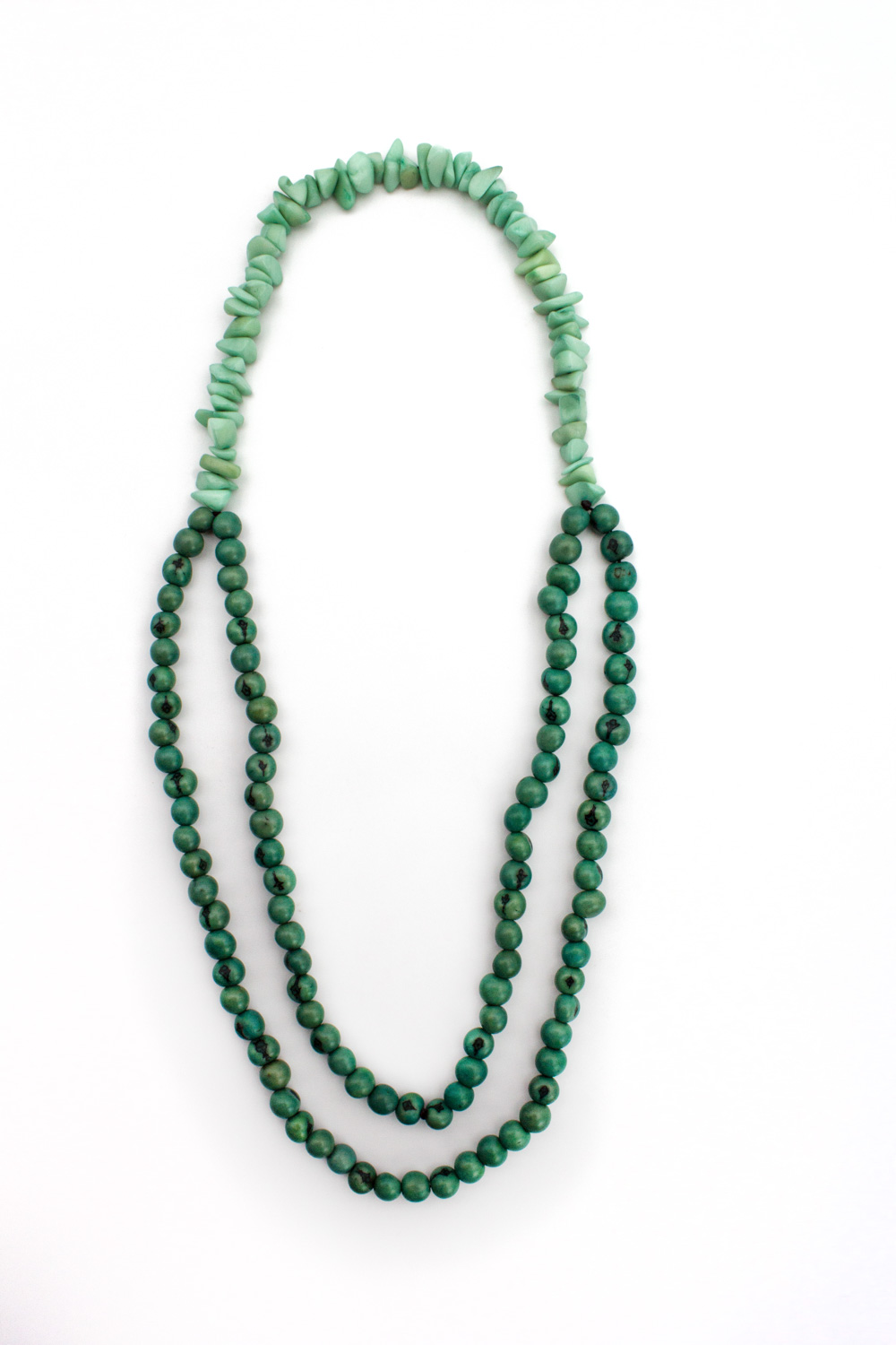 Collana lunga di perle acai in doppio filo e perle di tagua irregolare.