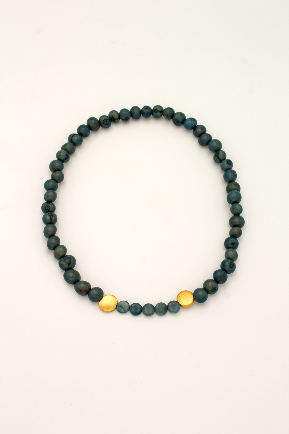 collana di perle di acai con alcuni dischi di tagua e due elementi in metallo placcato oro