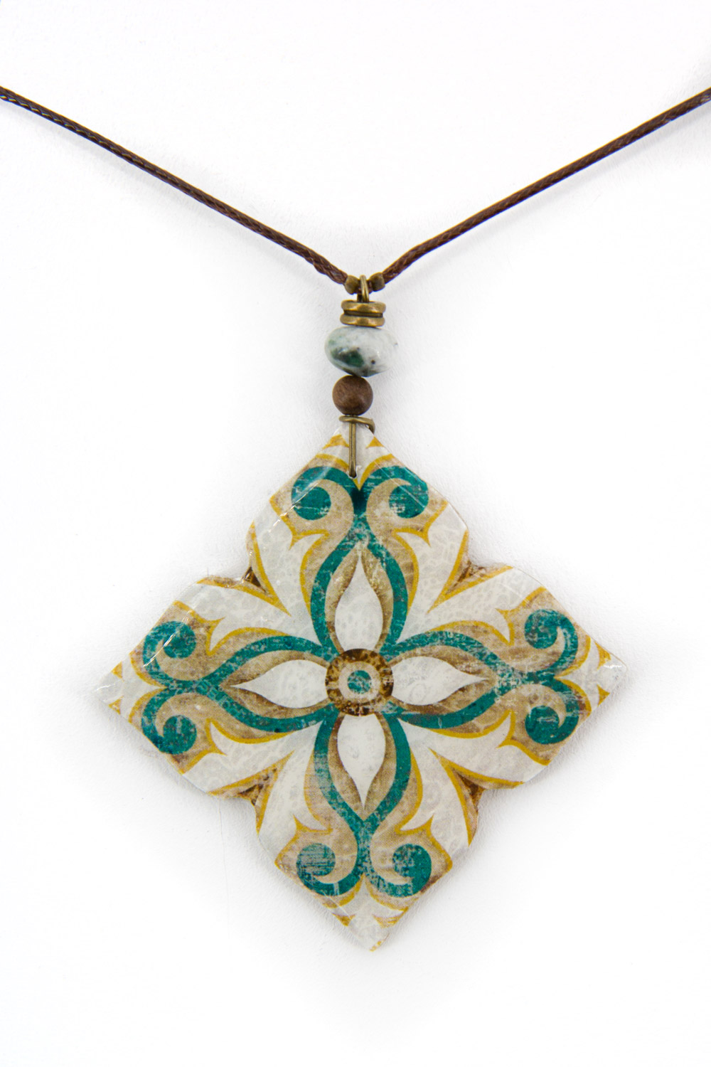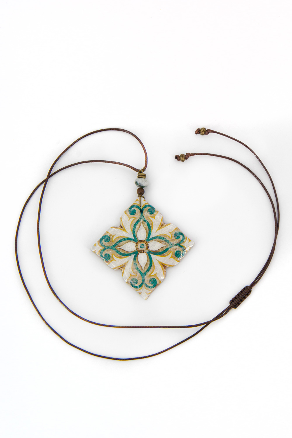 Collana con ciondolo a forma di primula in ceramica a freddo decorata su un sottile cordino di cotone cerato regolabile con nodo scorrevole. Piccole perline di vetro illuminano il ciondolo. L’elemento in ceramica è decorato con motivi geometrici colorati ispirati ai patterns delle antiche maioliche delle architetture islamiche-persiane; ogni fase è realizzata interamente a mano. Il fascino della tradizione si unisce ad una artigianalità innovativa creando pezzi unici raffinati e senza tempo.