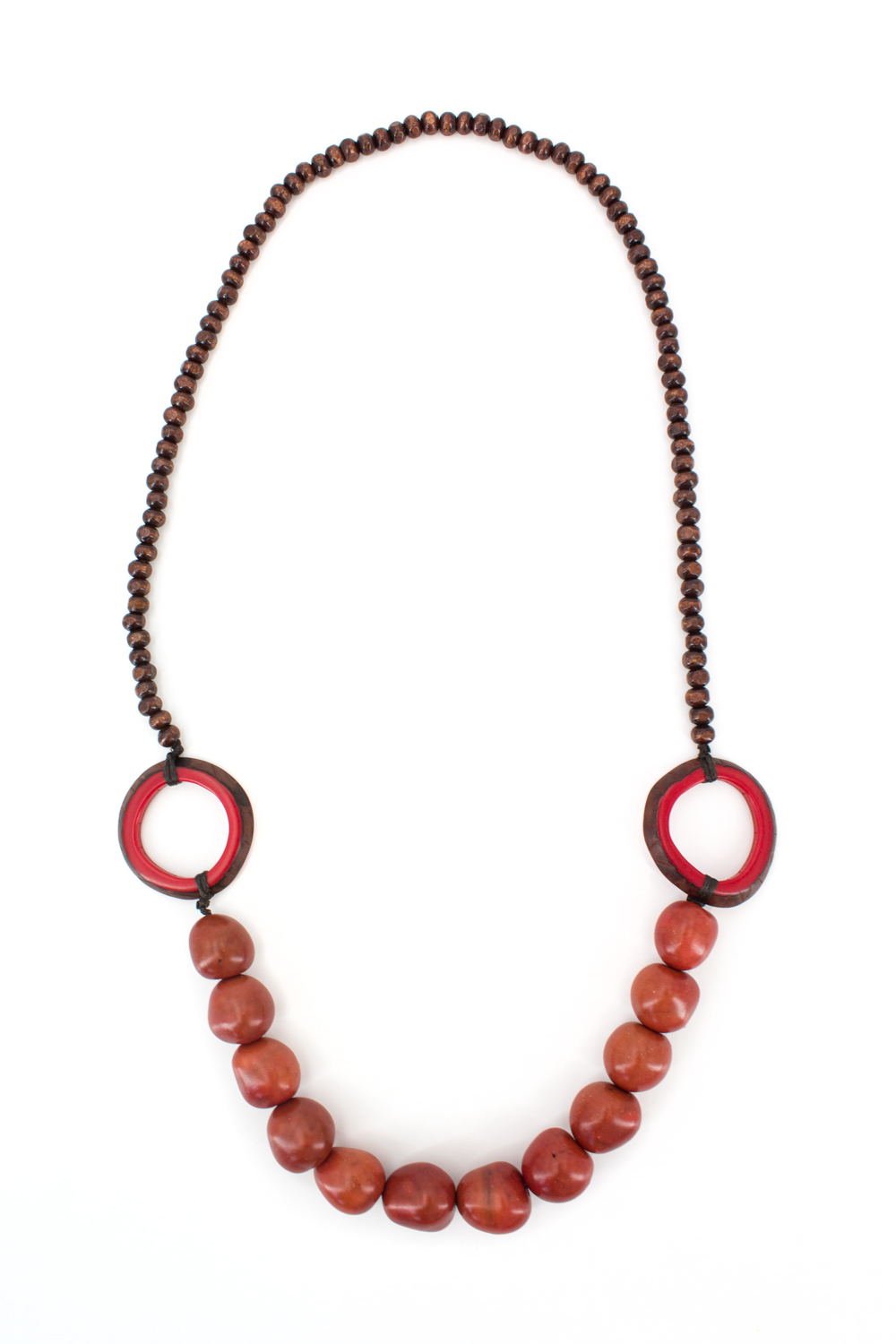 Collana lunghezza media con semi di chicon, 2 anelli in tagua e perline in legno.