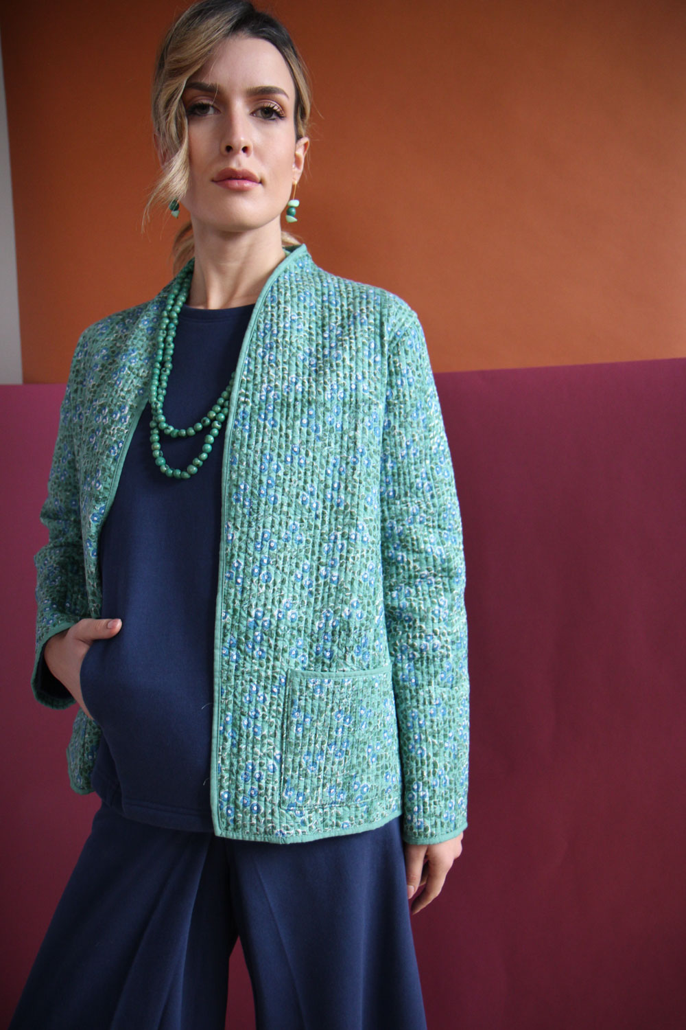 Giacca trapuntata in cotone stampato a mano block print disegno Pervinca. Questo capo è caratterizzato da un particolare collo montante, più alto nella parte dietro, che abbraccia la scollatura. La giacca dalla linea dritta e dalla vestibilità regolare è senza abbottonatura, si può portare aperta per un look più rilassato oppure con la fusciacca in tessuto coordinato o con uno dei bottoni magnetici della Sartoria Ismara. La fusciacca è un accessorio che aggiunge un elemento di stile e raffinatezza al look, soprattutto in occasioni più eleganti.
