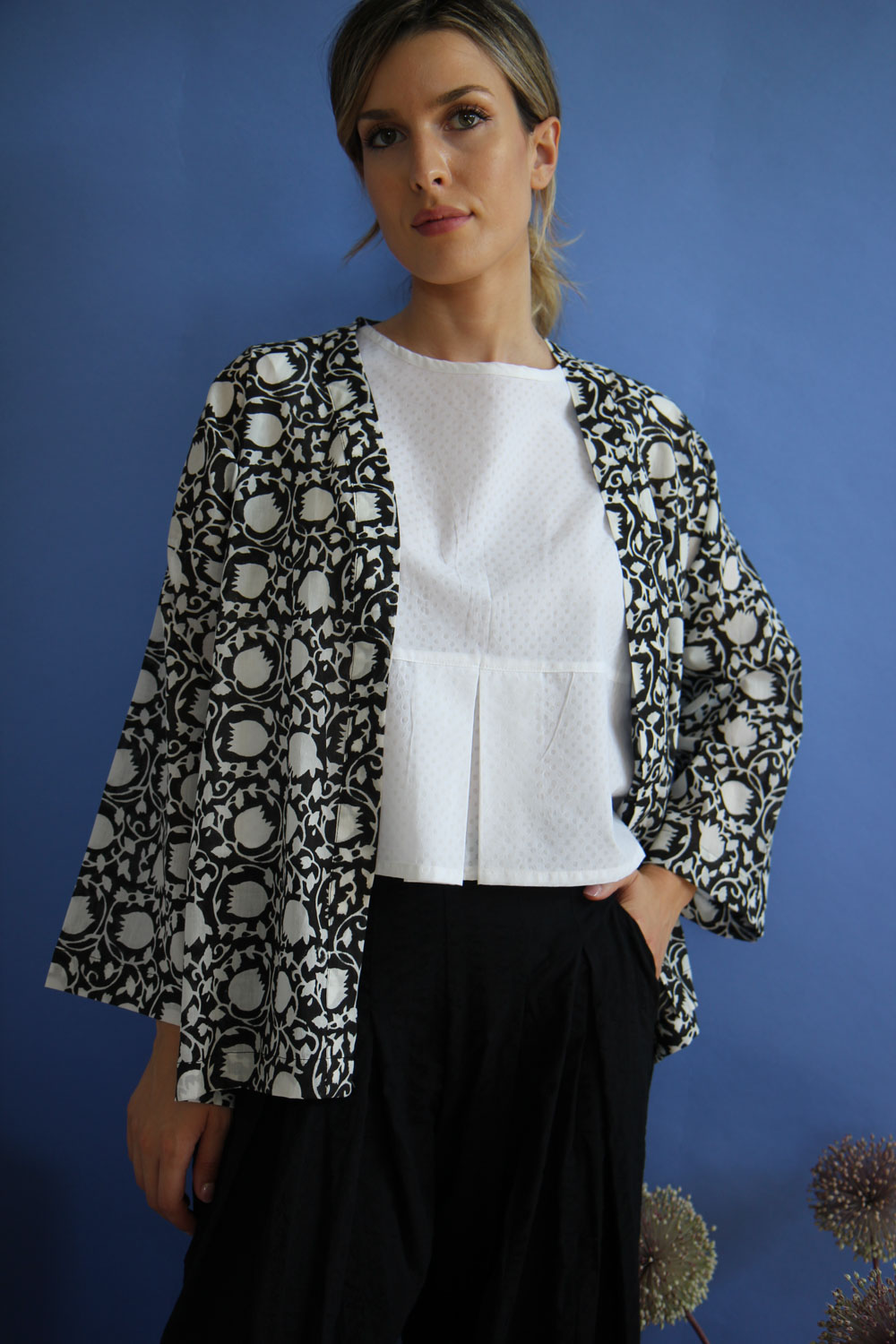 Giacca kimono corto in cotone leggerissimo con stampa a mano block print.