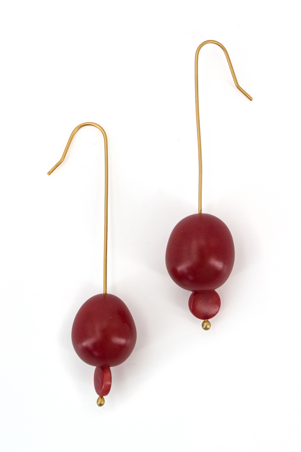 Orecchini pendenti con un seme di chicon e un piccolo disco in tagua. Gancio a stelo in metallo placcato oro anallergico.
