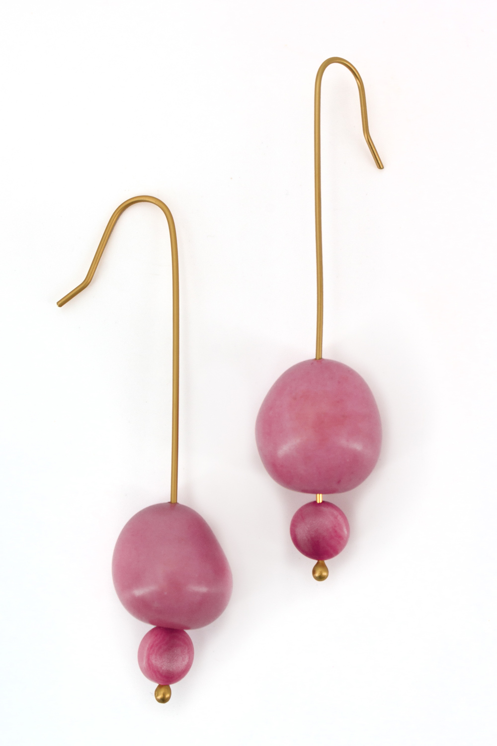 Orecchini pendenti con un seme di chicon e un piccolo disco in tagua. Gancio a stelo in metallo placcato oro anallergico.