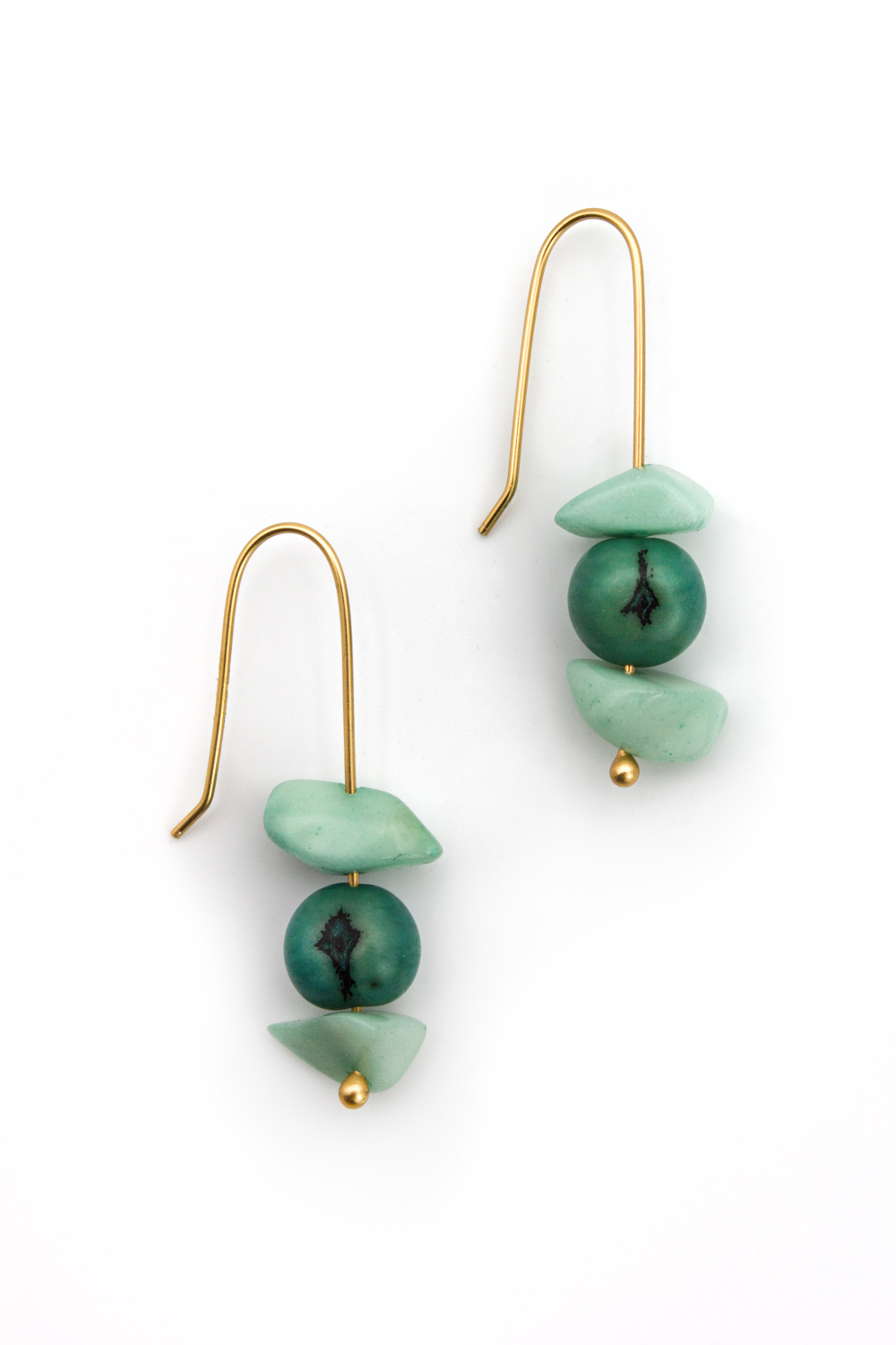 Orecchini pendenti con una perla di acai e due di tagua irregolare su gancio placcato oro a stelo ricurvo.