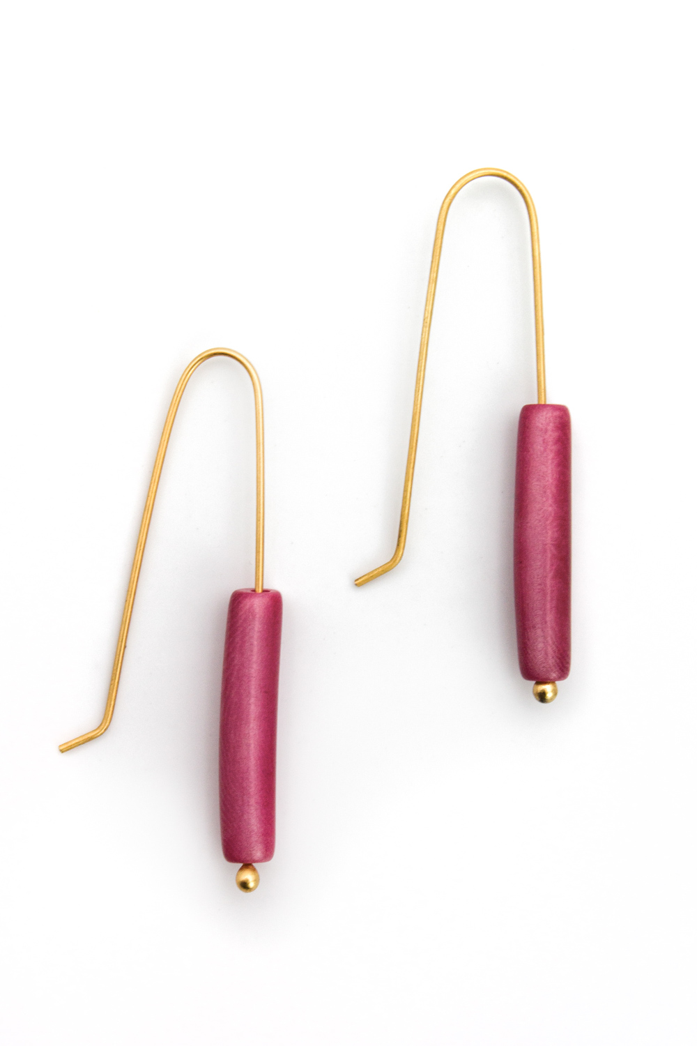 Orecchini pendenti con un elemento in tagua a forma di cilindro su gancio placcato oro a stelo ricurvo.