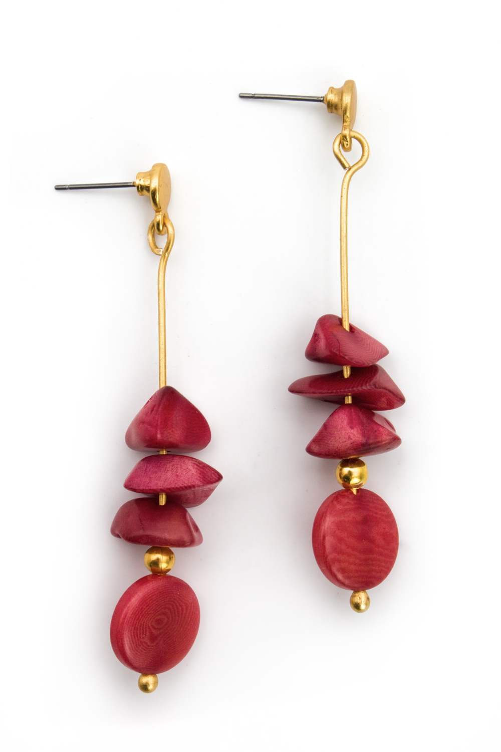 Orecchini pendenti con elementi in tagua irregolari e un mini disco in tagua su un gancio a stelo placcato oro anallergico. Chiusura a perno in acciaio inossidabile anallergico.