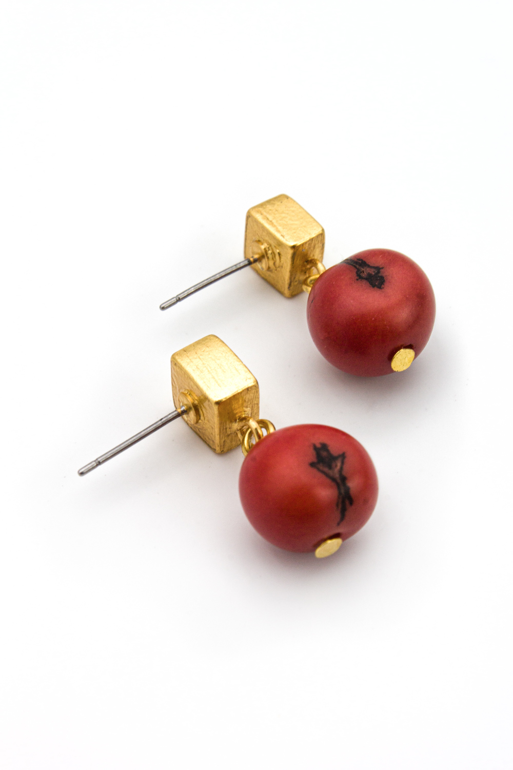 Orecchini pendenti con elemento a forma di cubo in metallo placcato oro e una perla di acai. Chiusura a perno in acciaio inossidabile anallergico.
