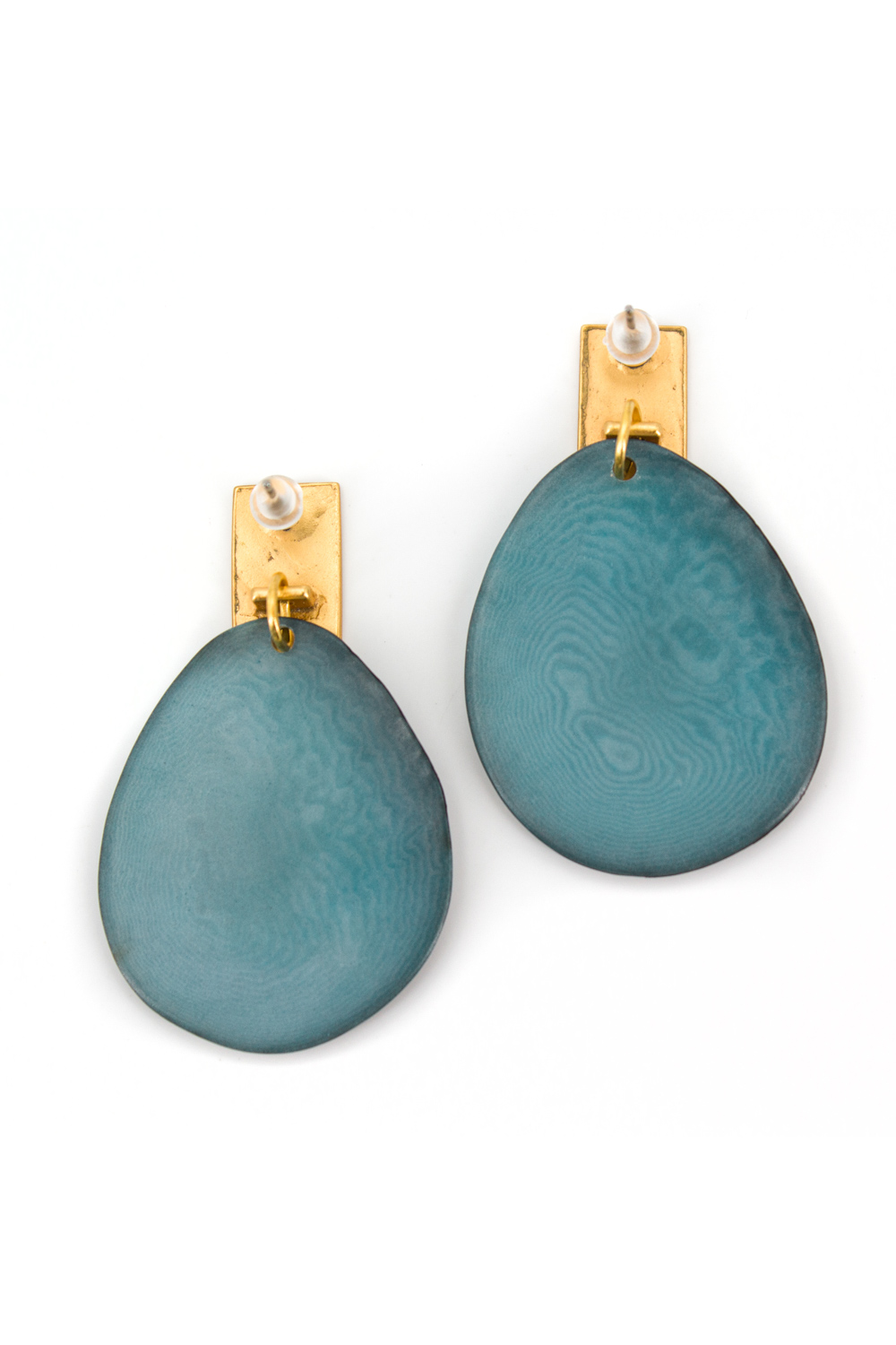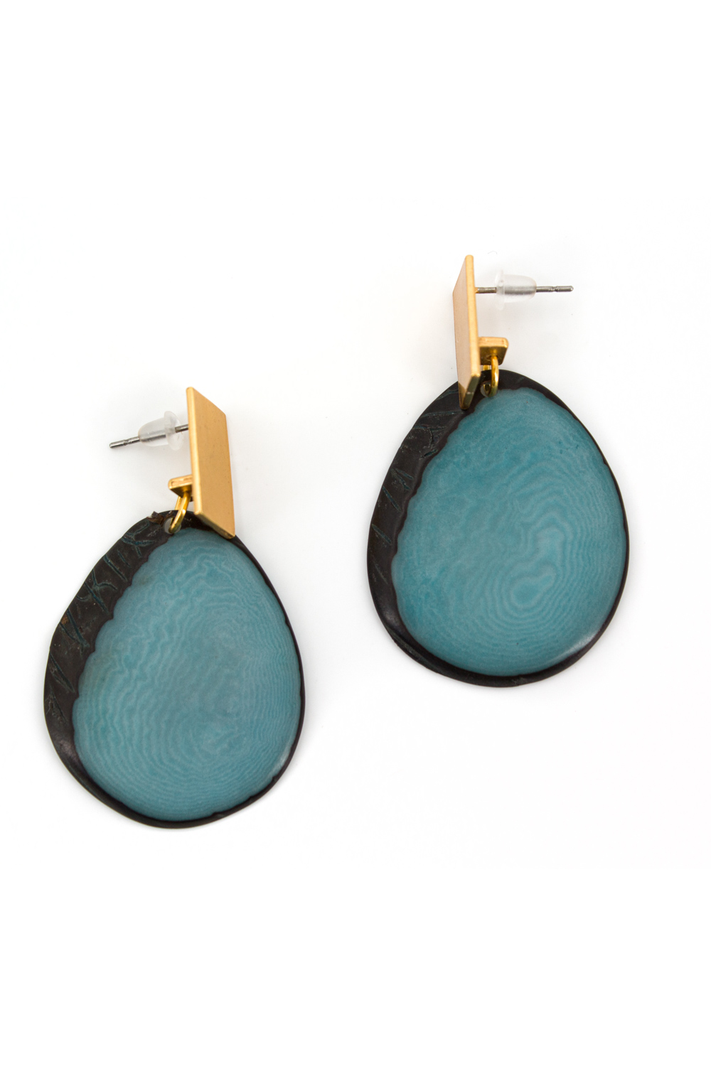 Orecchini a perno placcati oro anallergico arricchiti da un disco di tagua irregolare ed un elemento placcato oro.