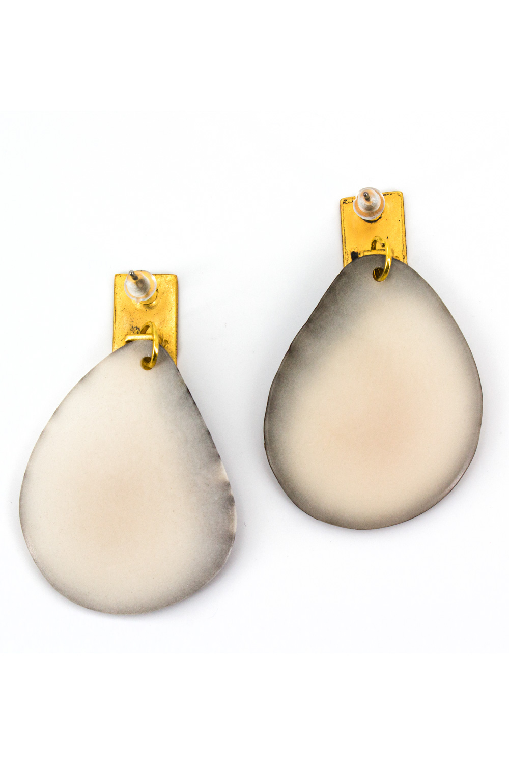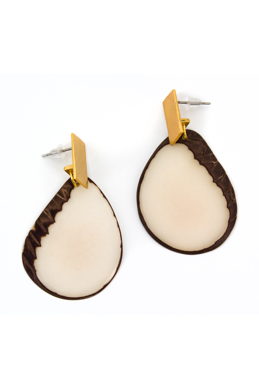 Orecchini a perno placcati oro anallergico arricchiti da un disco di tagua irregolare ed un elemento placcato oro.