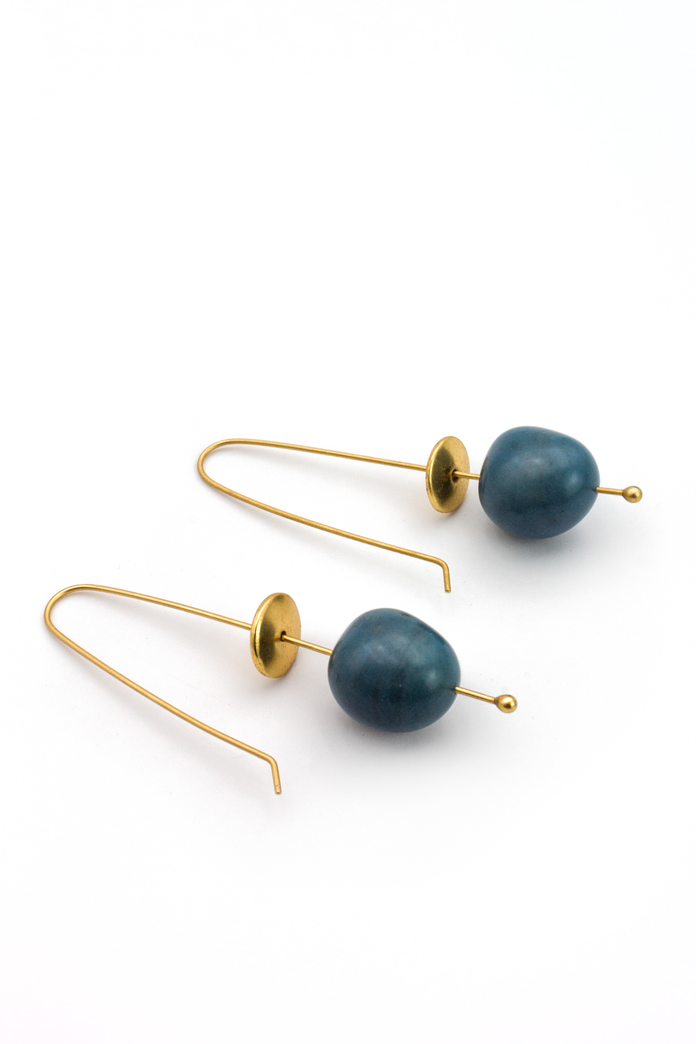Orecchini pendenti con un seme di chicon e un disco in metallo placcato oro. Gancio a stelo in metallo placcato oro anallergico.