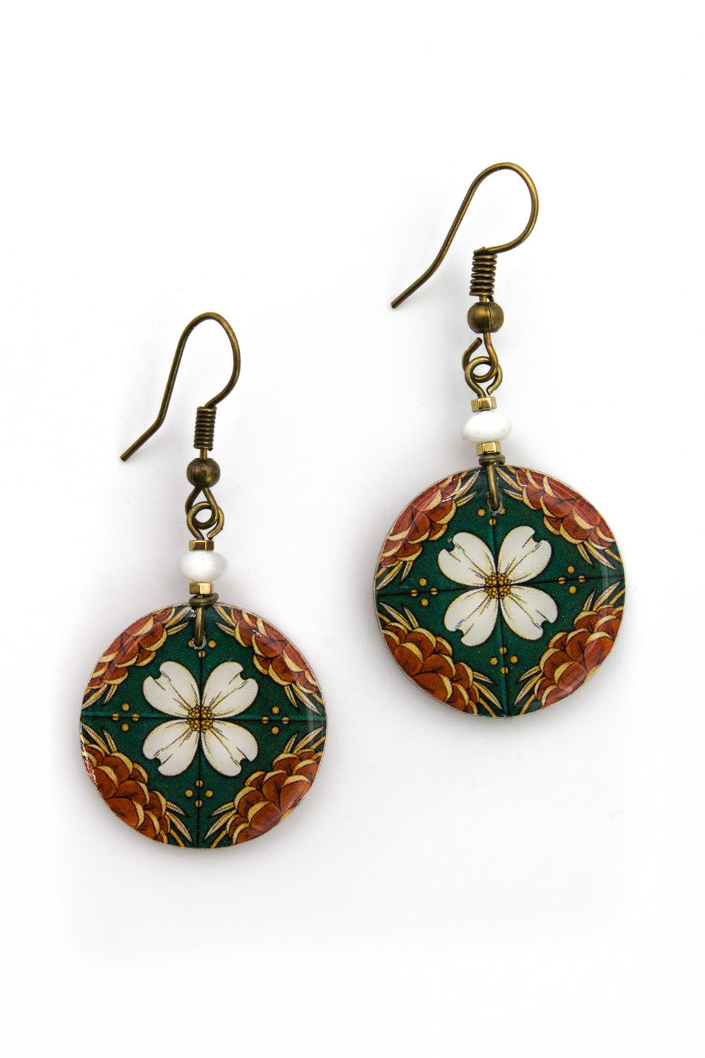 Orecchini pendenti con ciondolo a forma di disco in ceramica a freddo decorata con piccole perline in vetro. Chiusura con gancio ad amo in metallo anallergico colore bronzo effetto anticato.