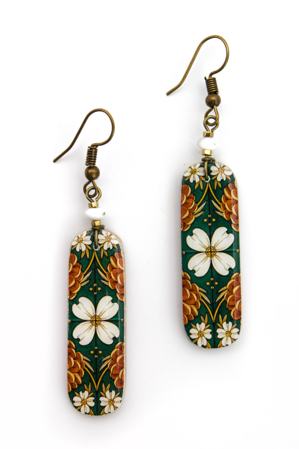 Orecchini pendenti con ciondolo a forma di lamella in ceramica a freddo decorata, illuminati da piccole perline in vetro. Chiusura con gancio ad amo in metallo anallergico colore bronzo effetto anticato.