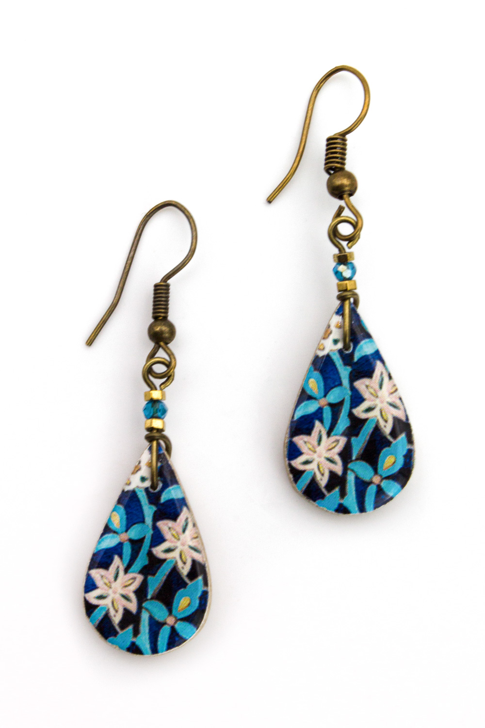 Orecchini pendenti con ciondolo a forma di goccia in ceramica a freddo decorata con piccole perline in vetro. Chiusura con gancio ad amo in metallo anallergico colore bronzo effetto anticato.