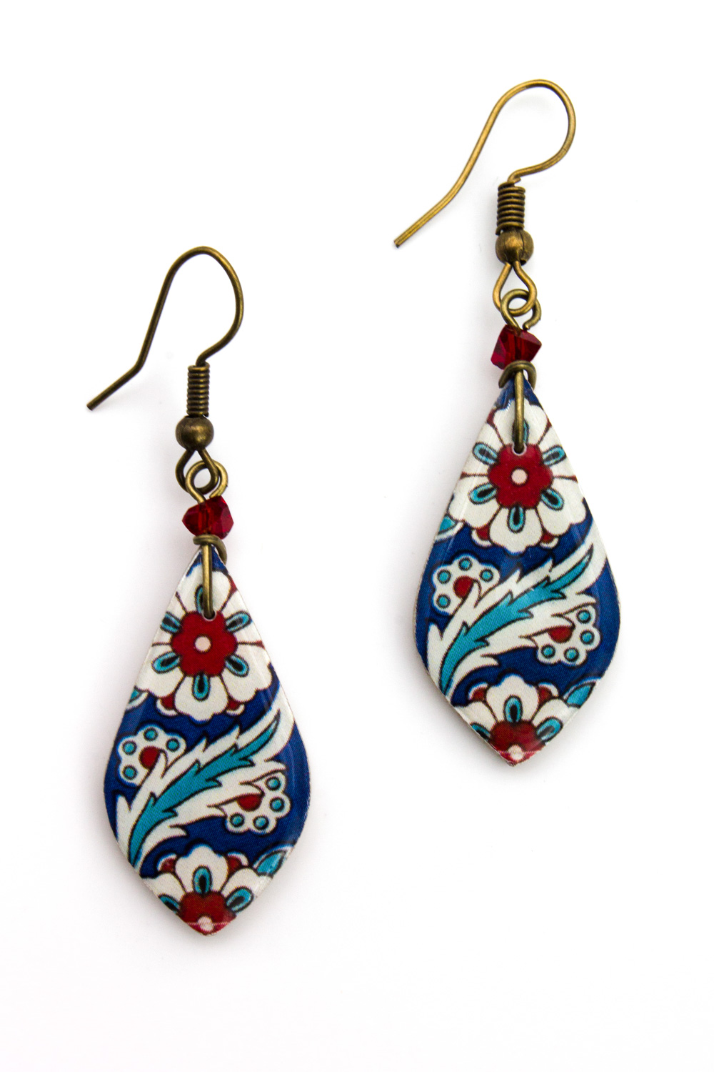 Orecchini pendenti con ciondolo a forma di petalo in ceramica a freddo decorata, illuminati da piccole perline in vetro. Chiusura con gancio ad amo in metallo anallergico colore bronzo effetto anticato.