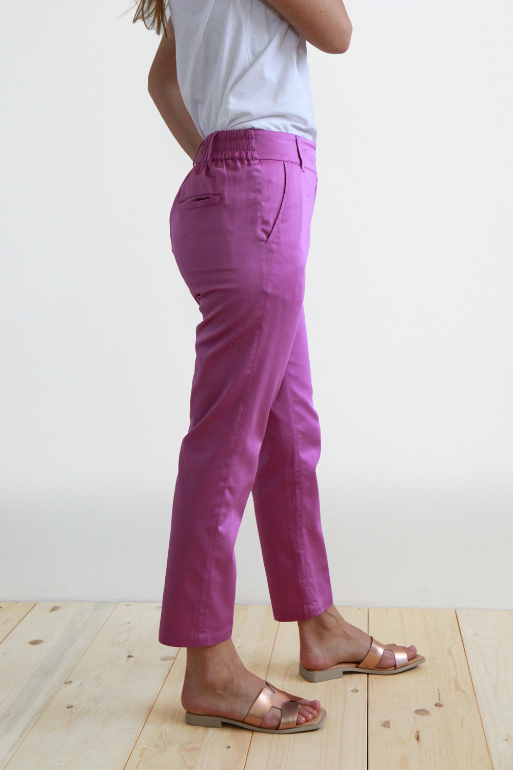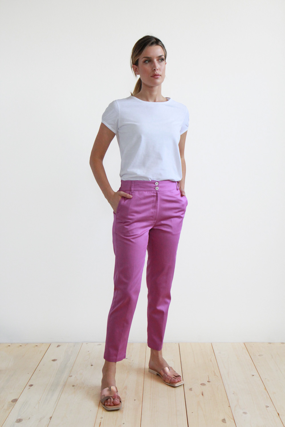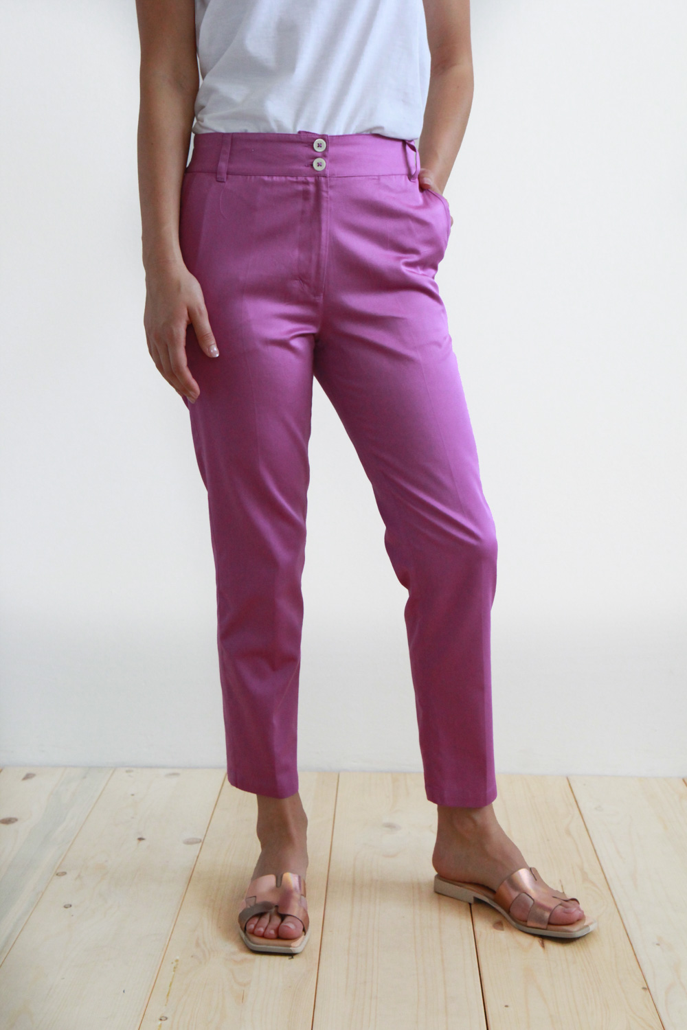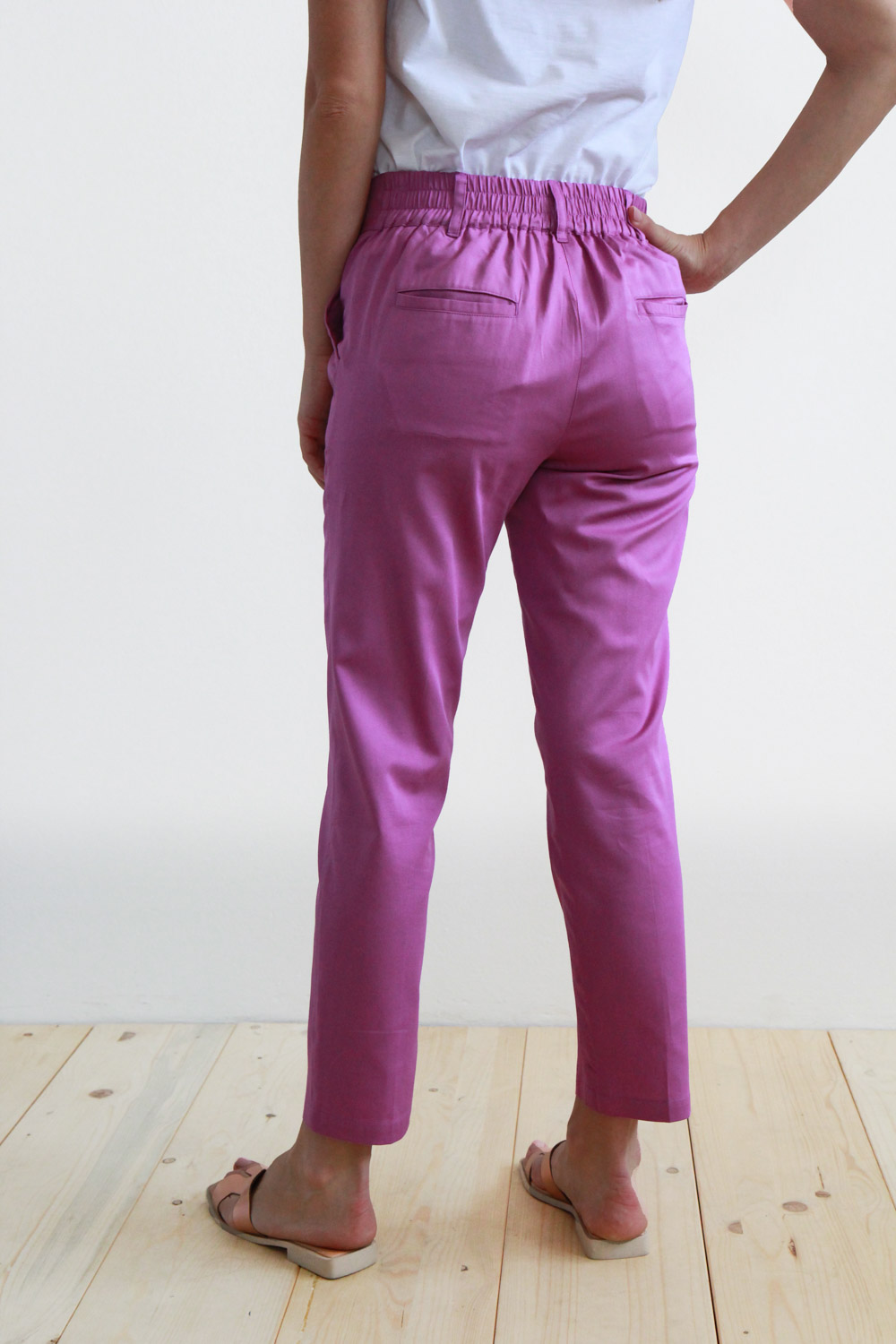 Pantalone a sigaretta in cotone satin. La vita con passanti è regolare sul davanti, chiusura a zip coperta e doppio bottone in madreperla. La banda elastica posta sul retro li rende comodi e pratici ad ogni occasione. Questo capo infine è rifinito con tasche alla francese sul davanti e due tasche a filetto sul retro. Un vero must have per la stagione estiva.