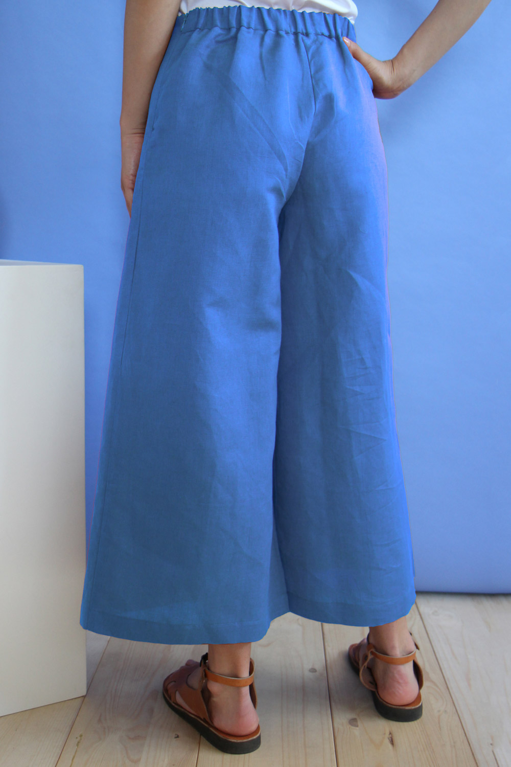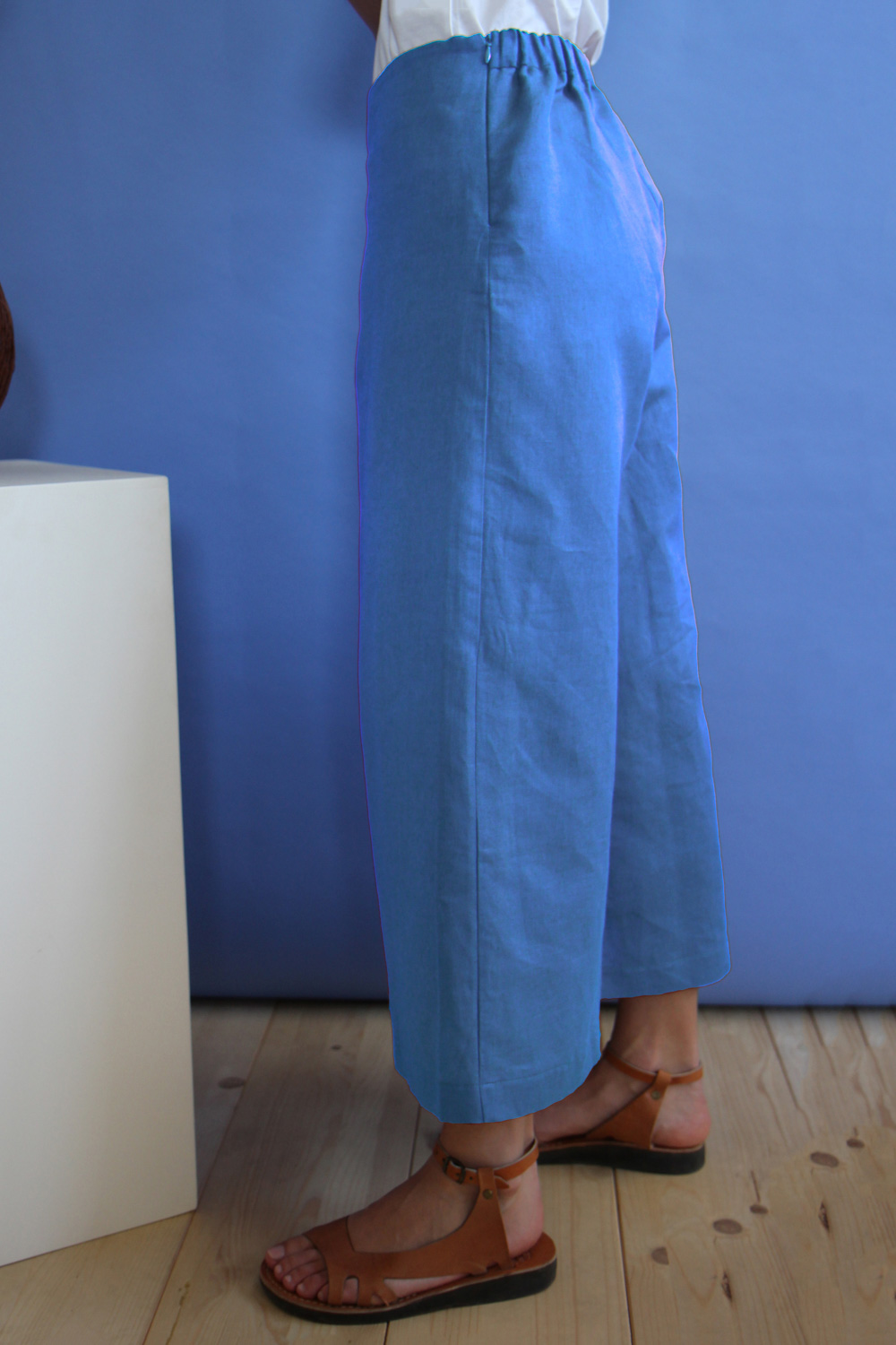 Pantalone ampio lunghezza sotto il polpaccio in misto lino e cotone. Il dettaglio della profonda piega baciata al centro sul fronte dà un tocco di originalità al capo e unito alla fascia elastica in vita sul retro rende il capo confortevole da indossare in qualunque occasione. Zip sul fianco. L’ampiezza della piega e della gamba donano volume e movimento al capo.