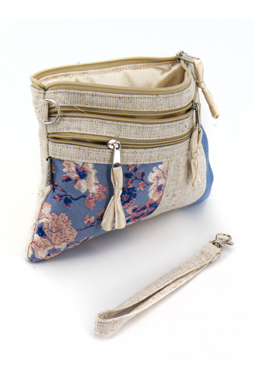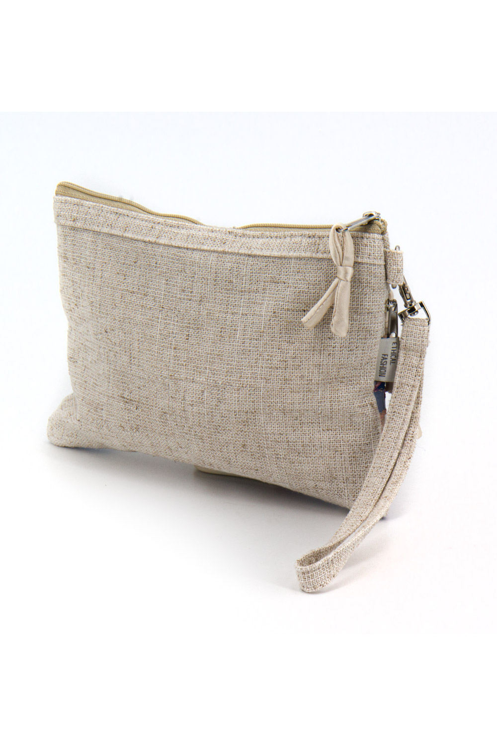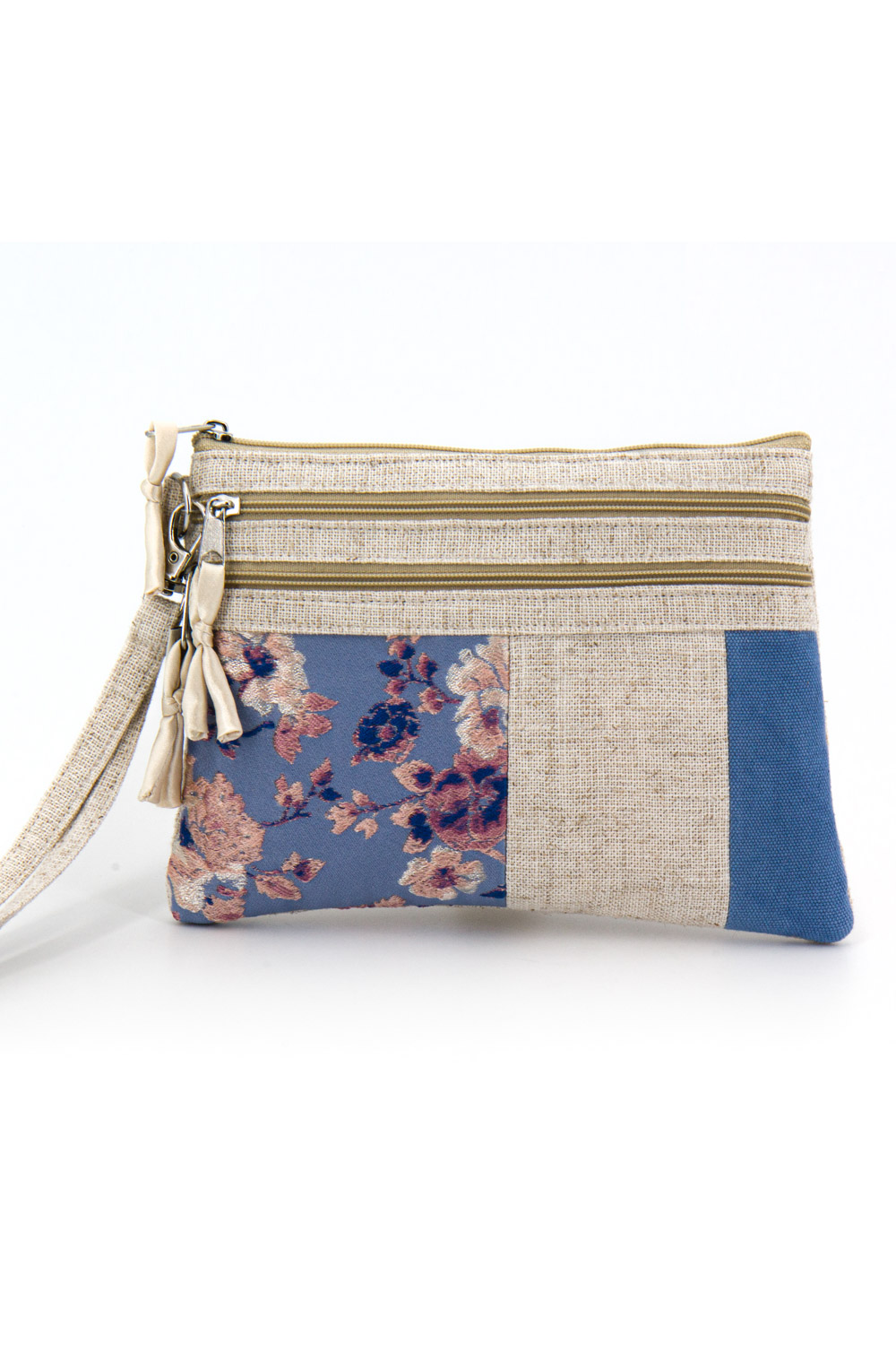 Pochette da portare a mano in mix di tessuti e fantasie su base lino ecrù. Dotata di un piccolo manico. Tre scomparti con zip e interni foderati.
