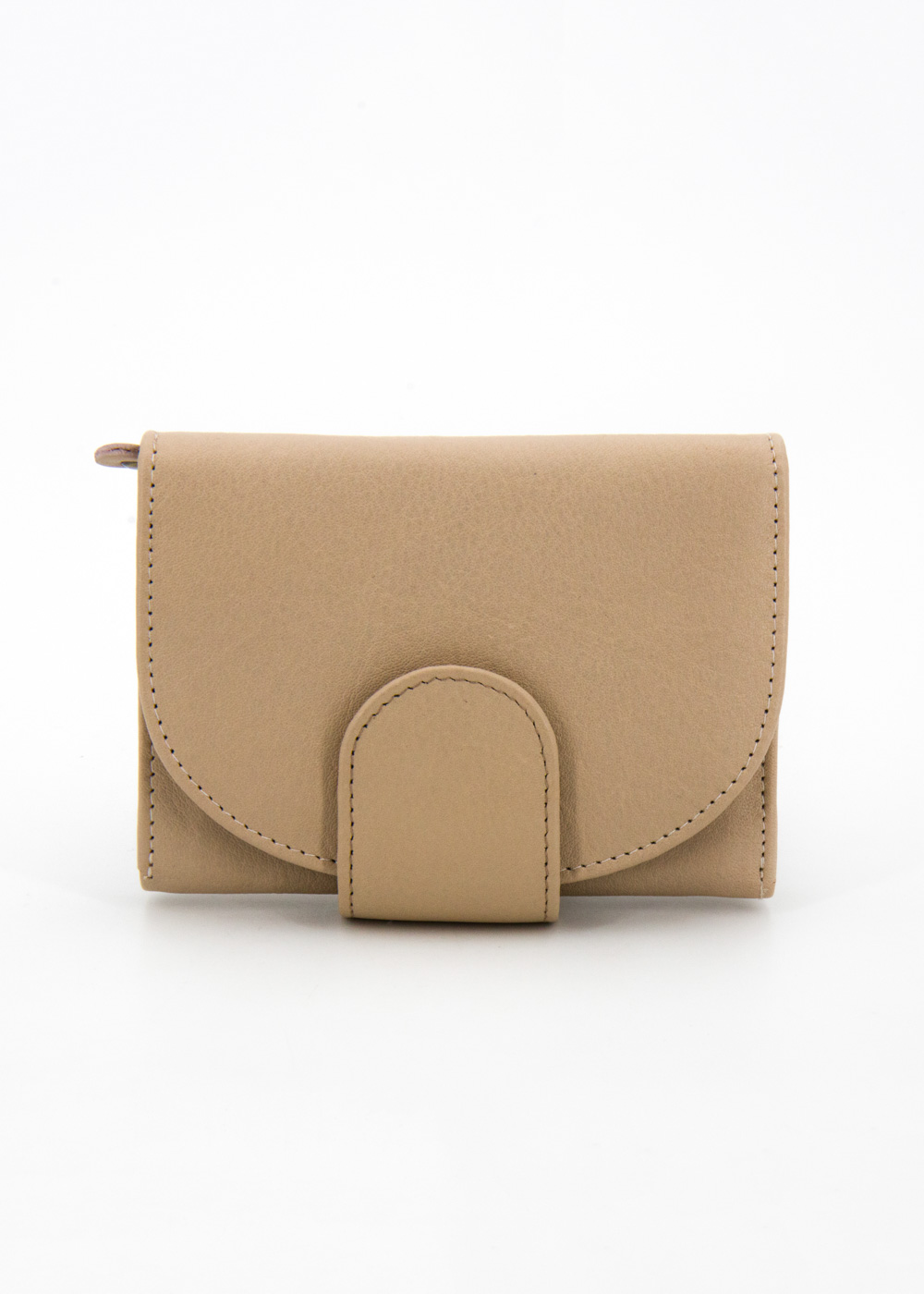 Portafoglio donna in morbida nappa bovina, chiusura con bottone a pressione. All’interno due scomparti per le monete con chiusura a zip, due scomparti per le banconote e vari porta carte. Interno foderato in cotone a righe.