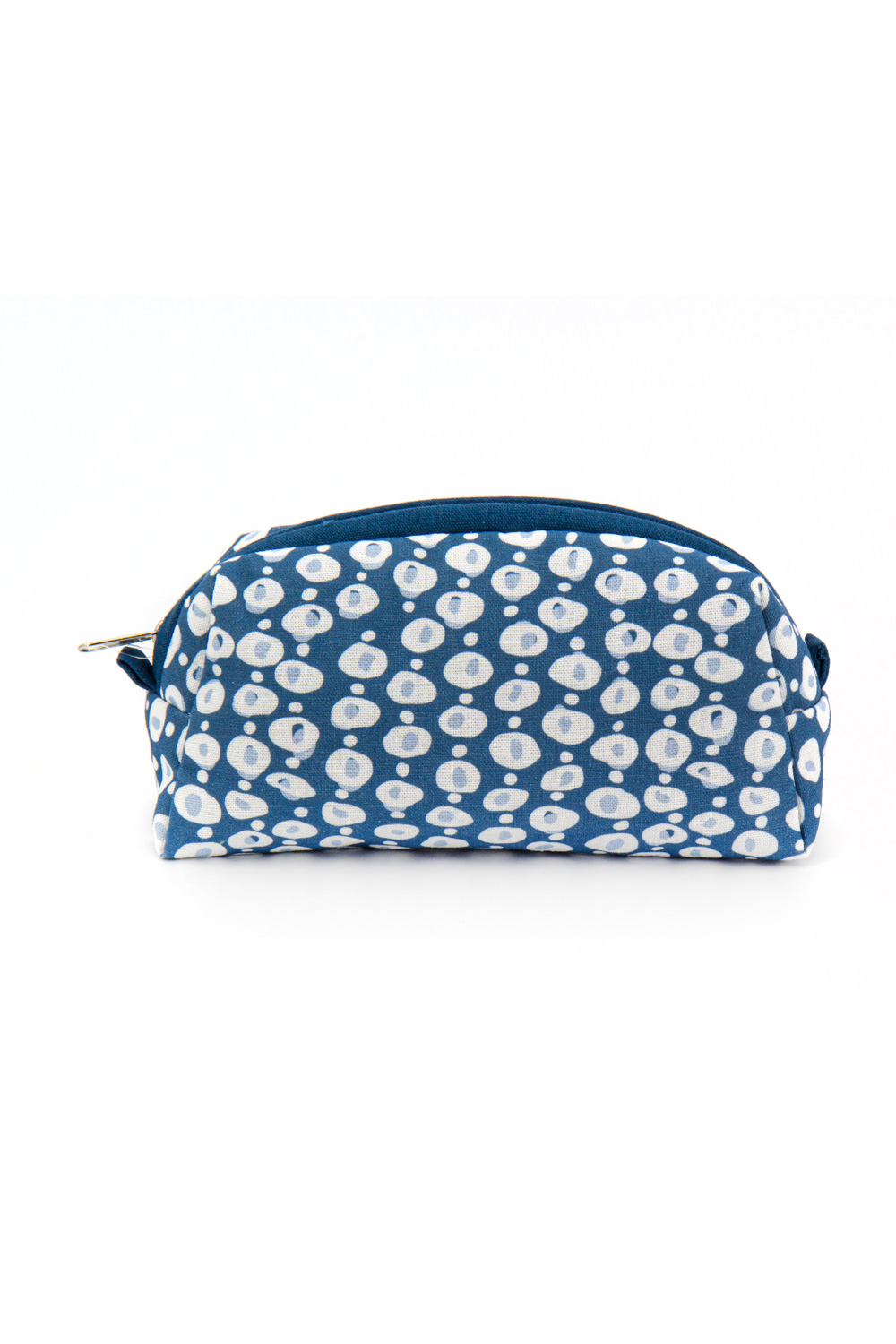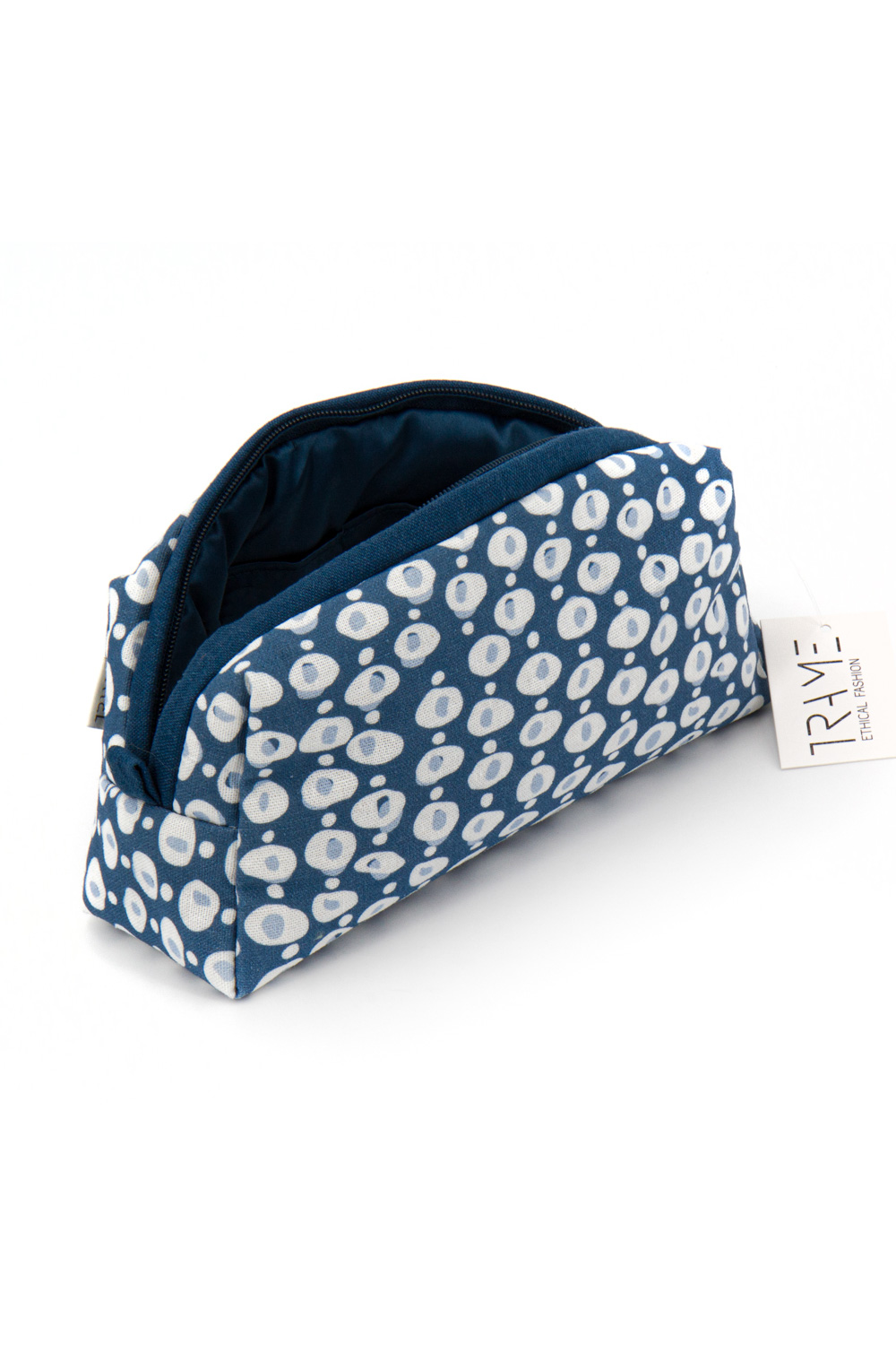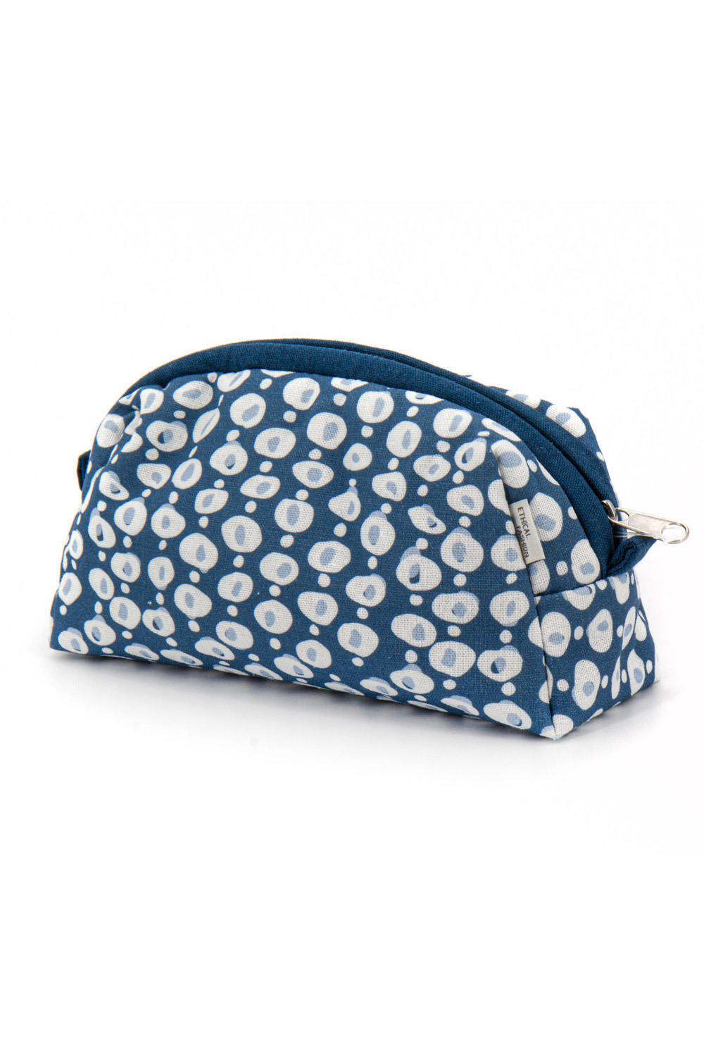 Astuccio portacosmetici in lino stampato su colore base blu denim. Chiusura con zip. Interno foderato e due tasche portaoggetti piatte.