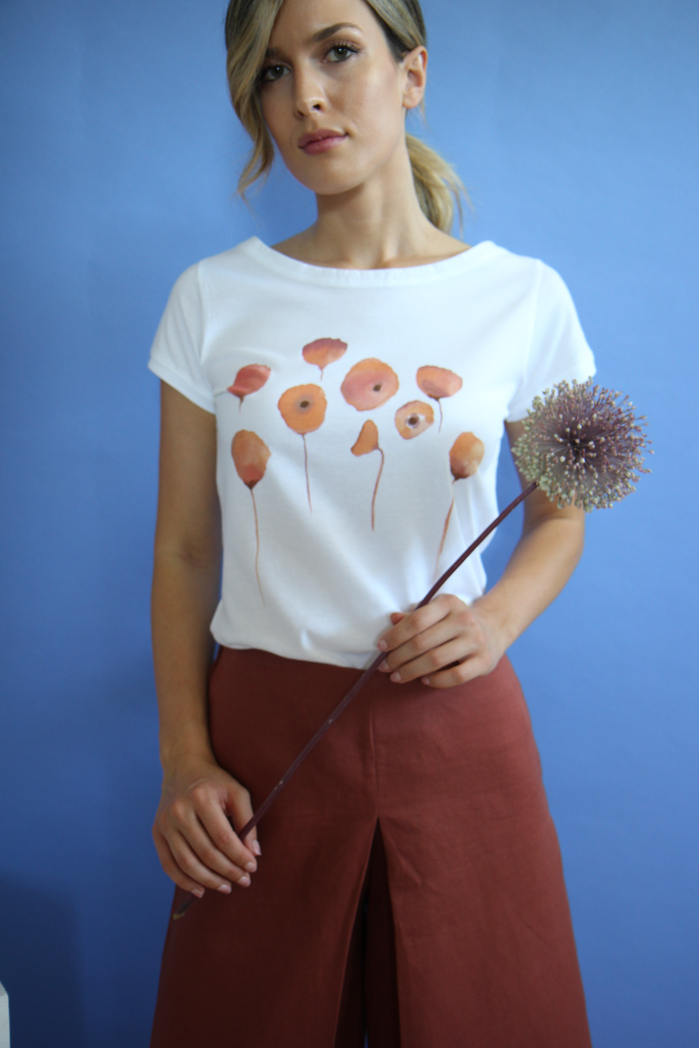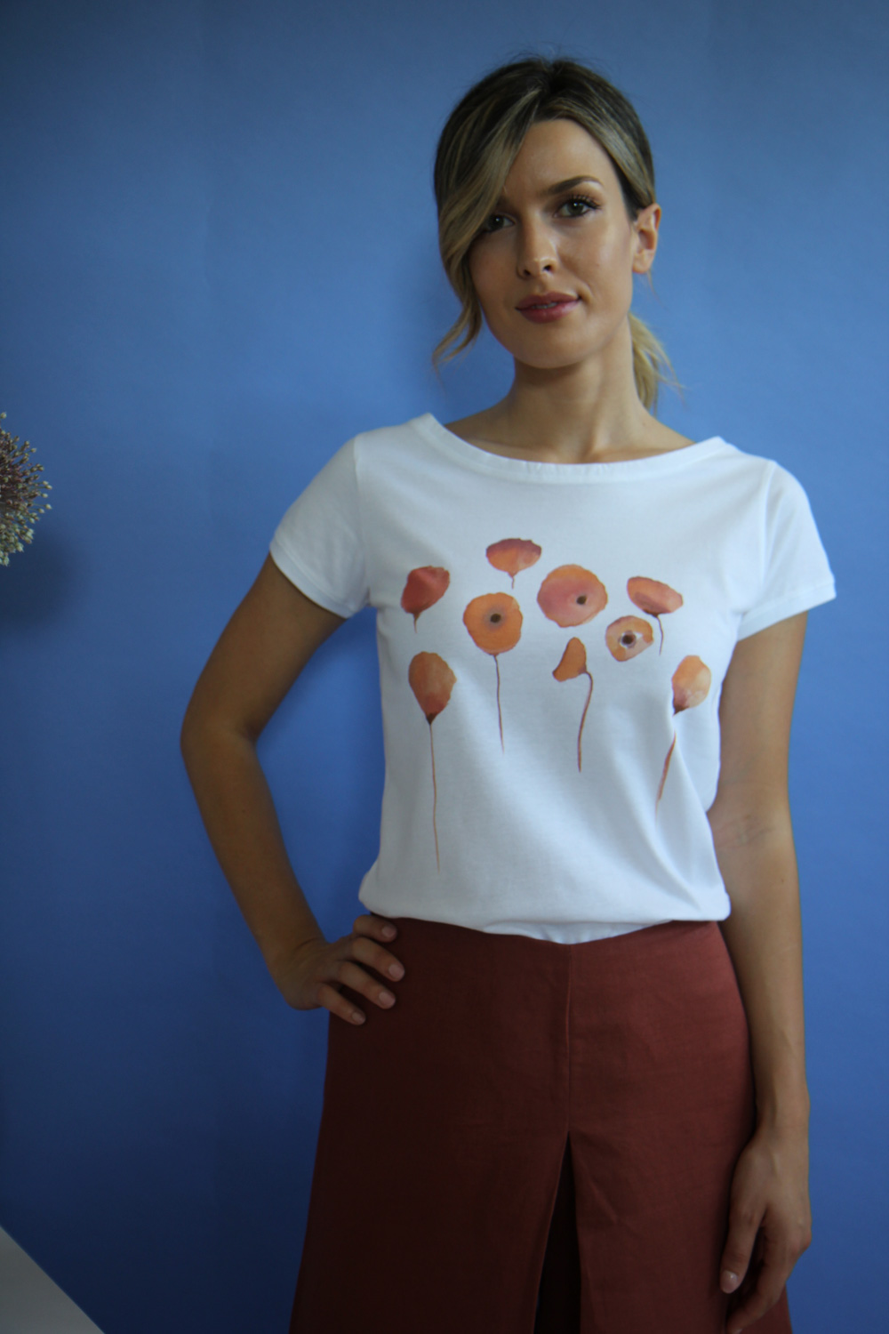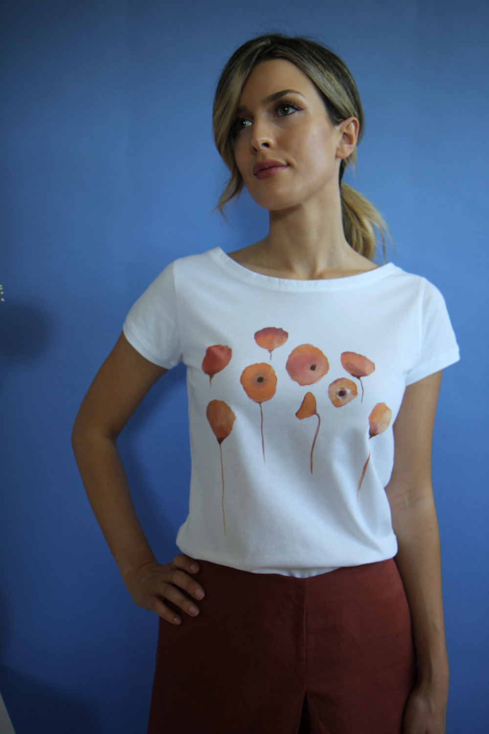 T-shirt in morbido jersey di cotone biologico certificato GOTS e FAIRTRADE. Linea dritta con scollo a barchetta, manichee corte, vestibilità regular. T-shirt impreziosita dal disegno “Les Pavots” dipinto a mano con colori acrilici ad acqua permanenti lavabili. Realizzato dal laboratorio artigianale RatafiàFirenze