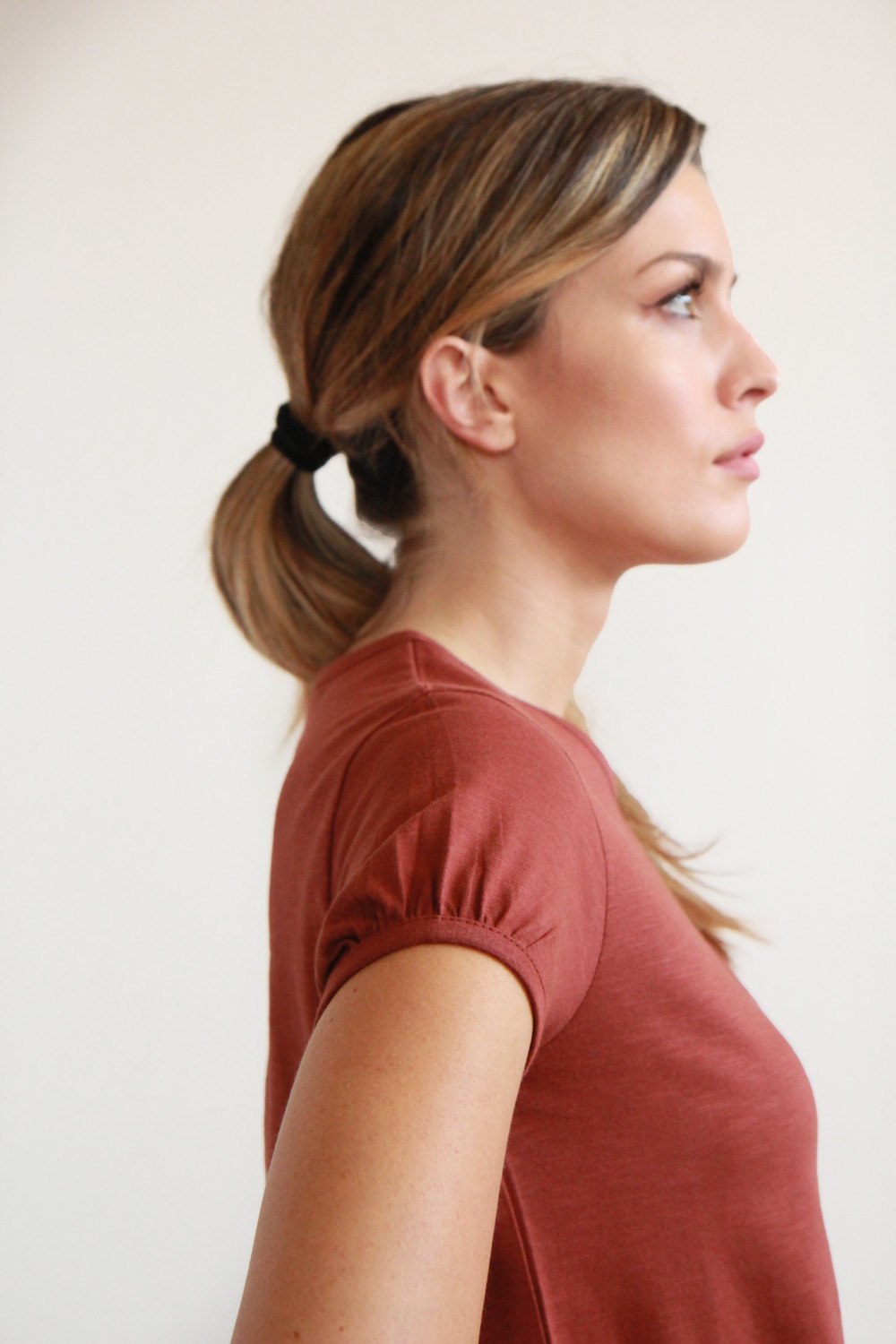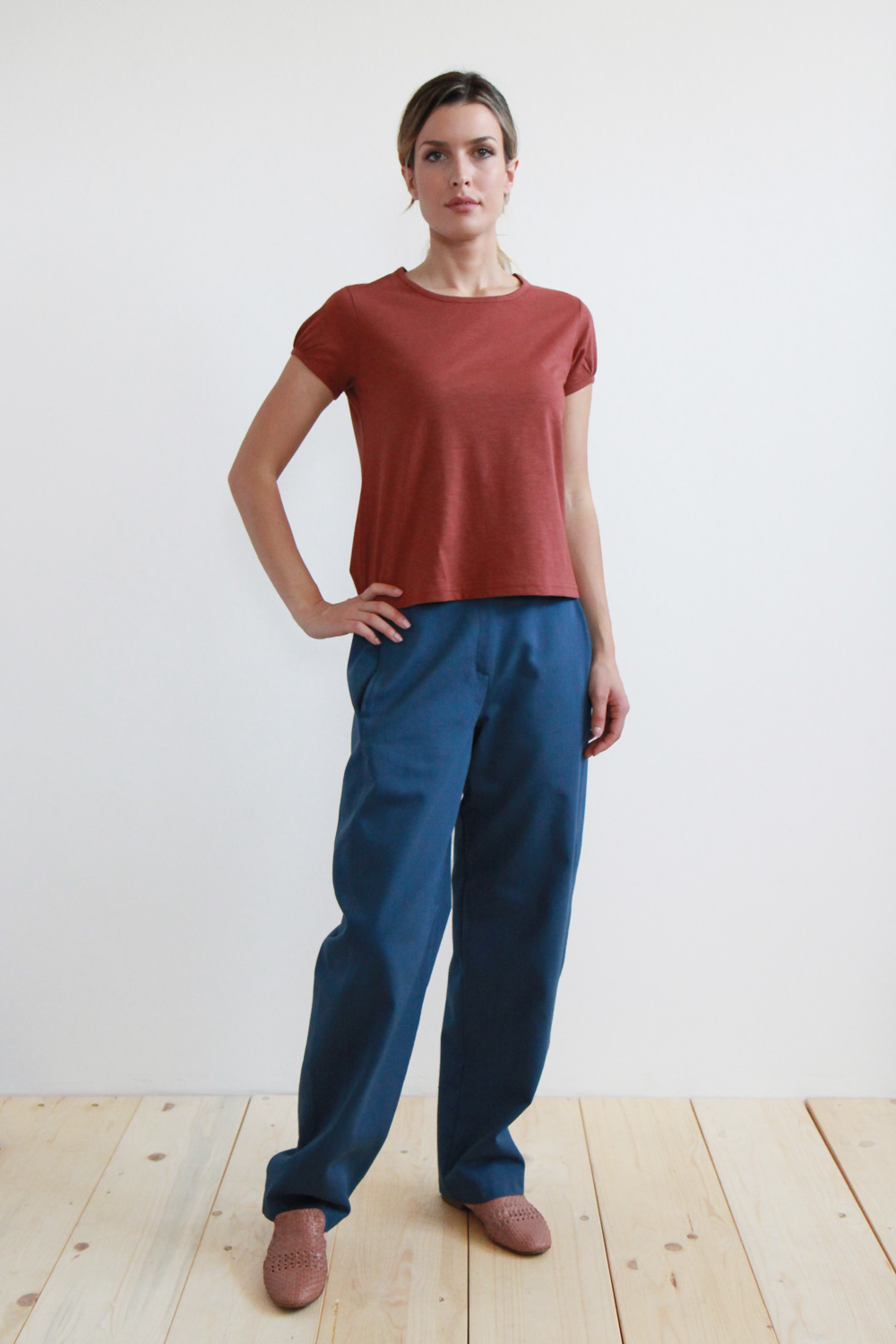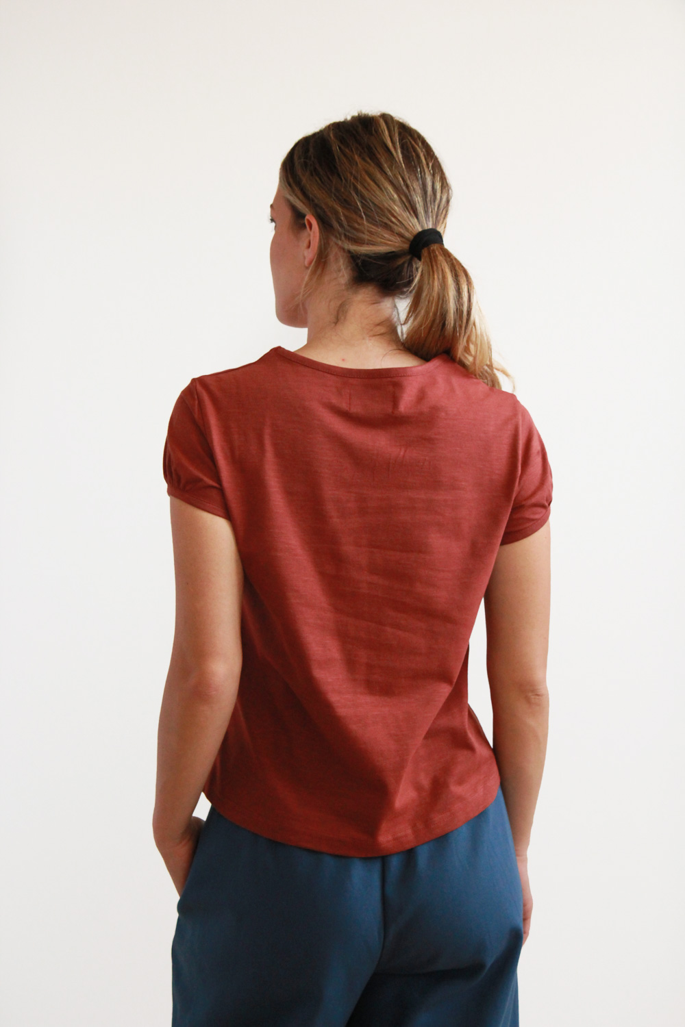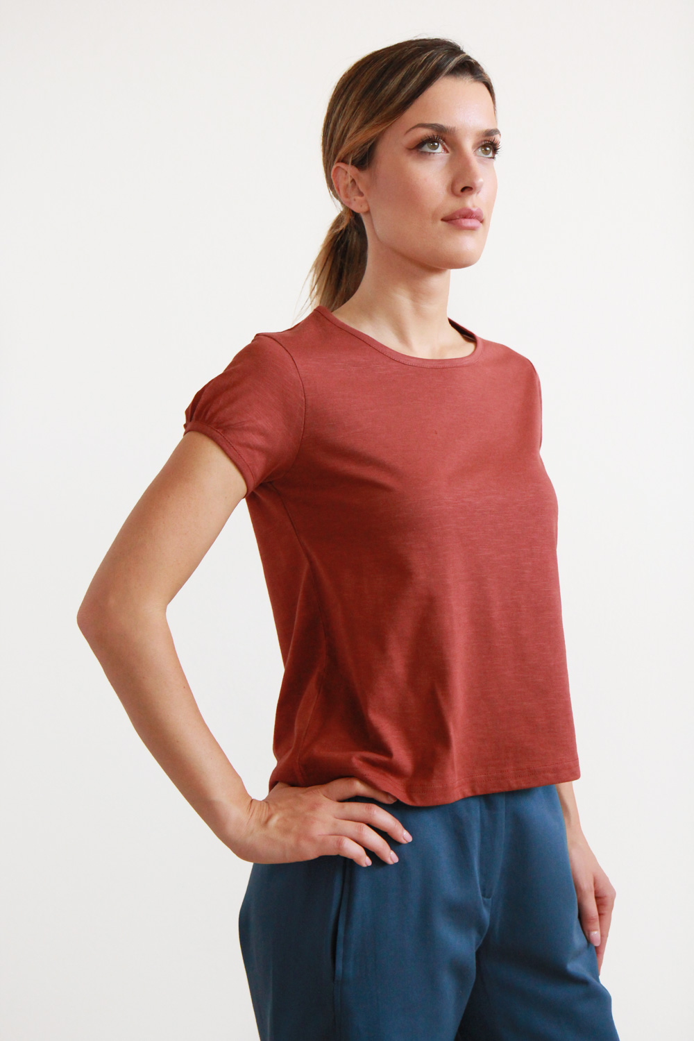 T-shirt a maniche corte in jersey di cotone biologico certificato GOTS, dalla trama fiammata. Linea dritta con collo a giro e dettaglio pieghe sulle maniche con polsino bordato.