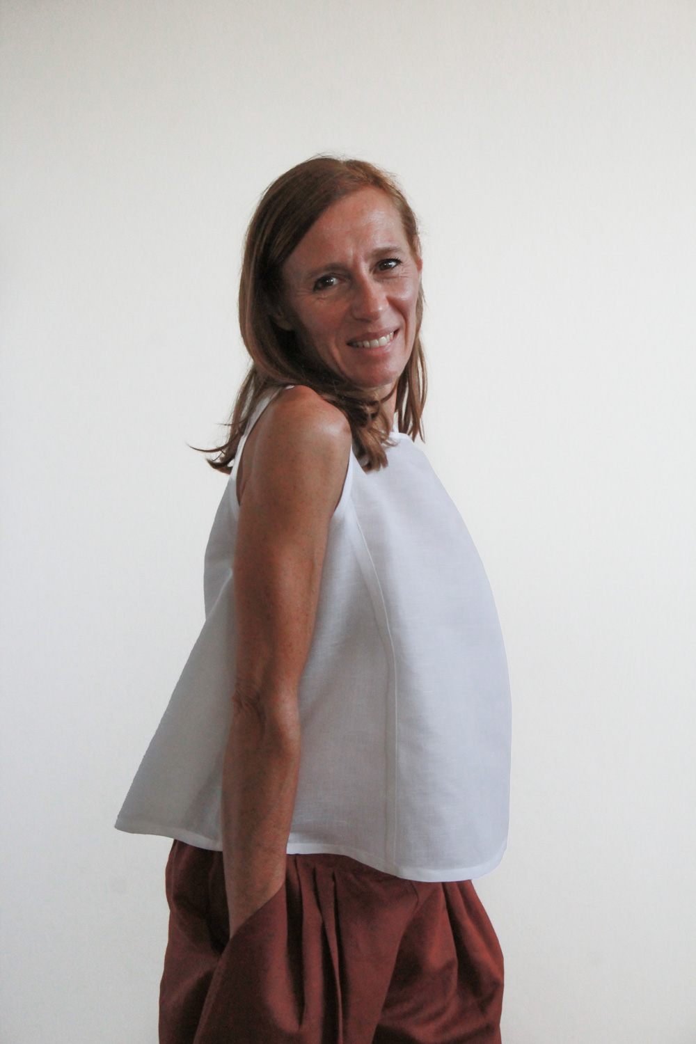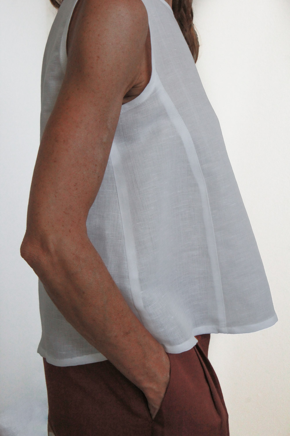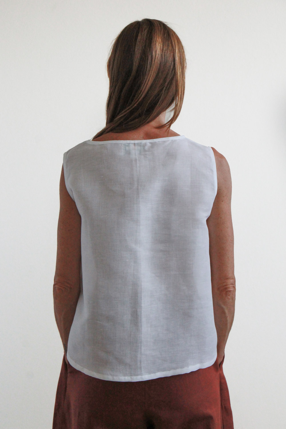 Top smanicato in misto lino e cotone. Vestibilità regolare, linea svasata, scollatura tonda e ampia, spalle larghe e due tagli che assorbono le due riprese sul davanti rendono ancora più confortevole il capo.