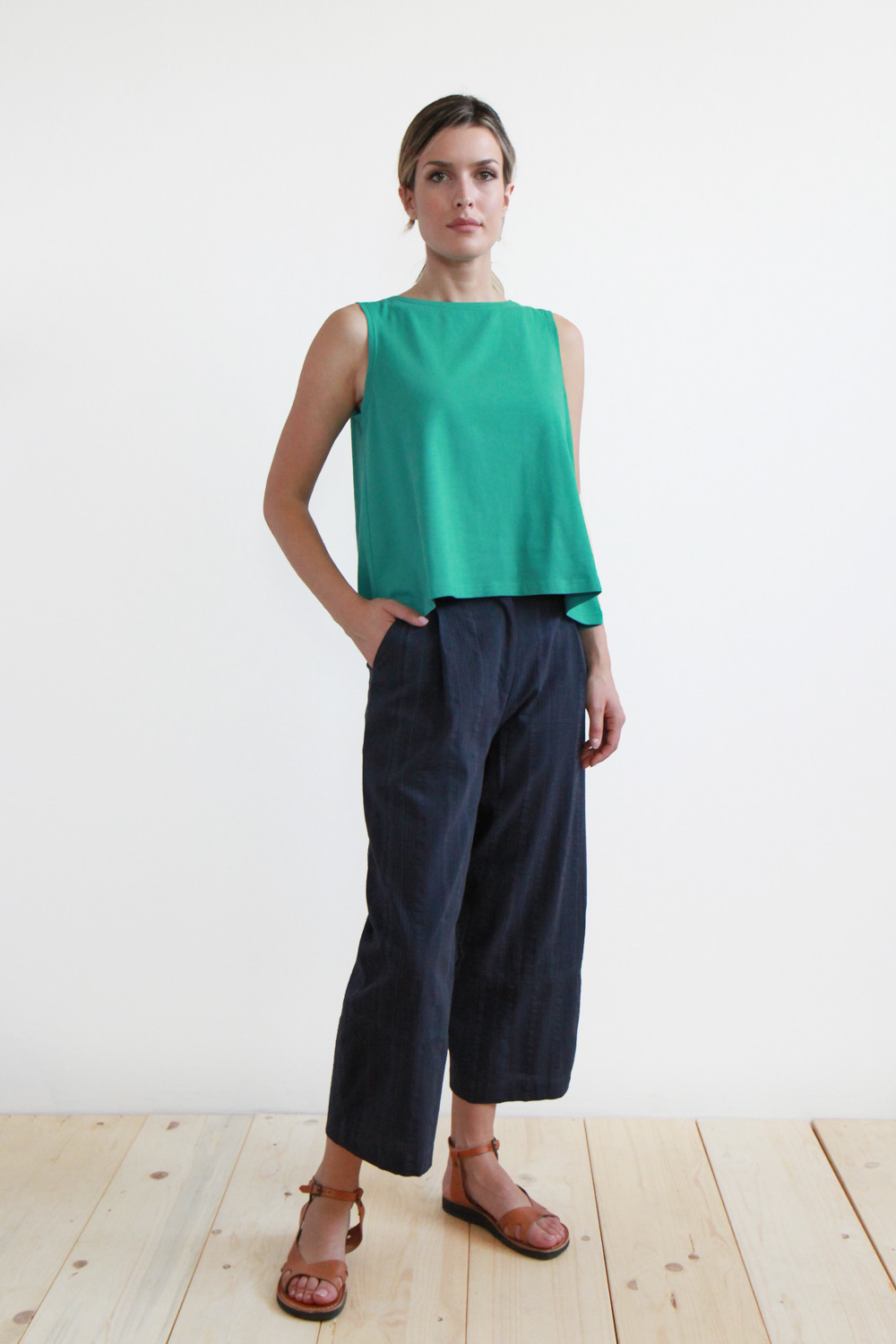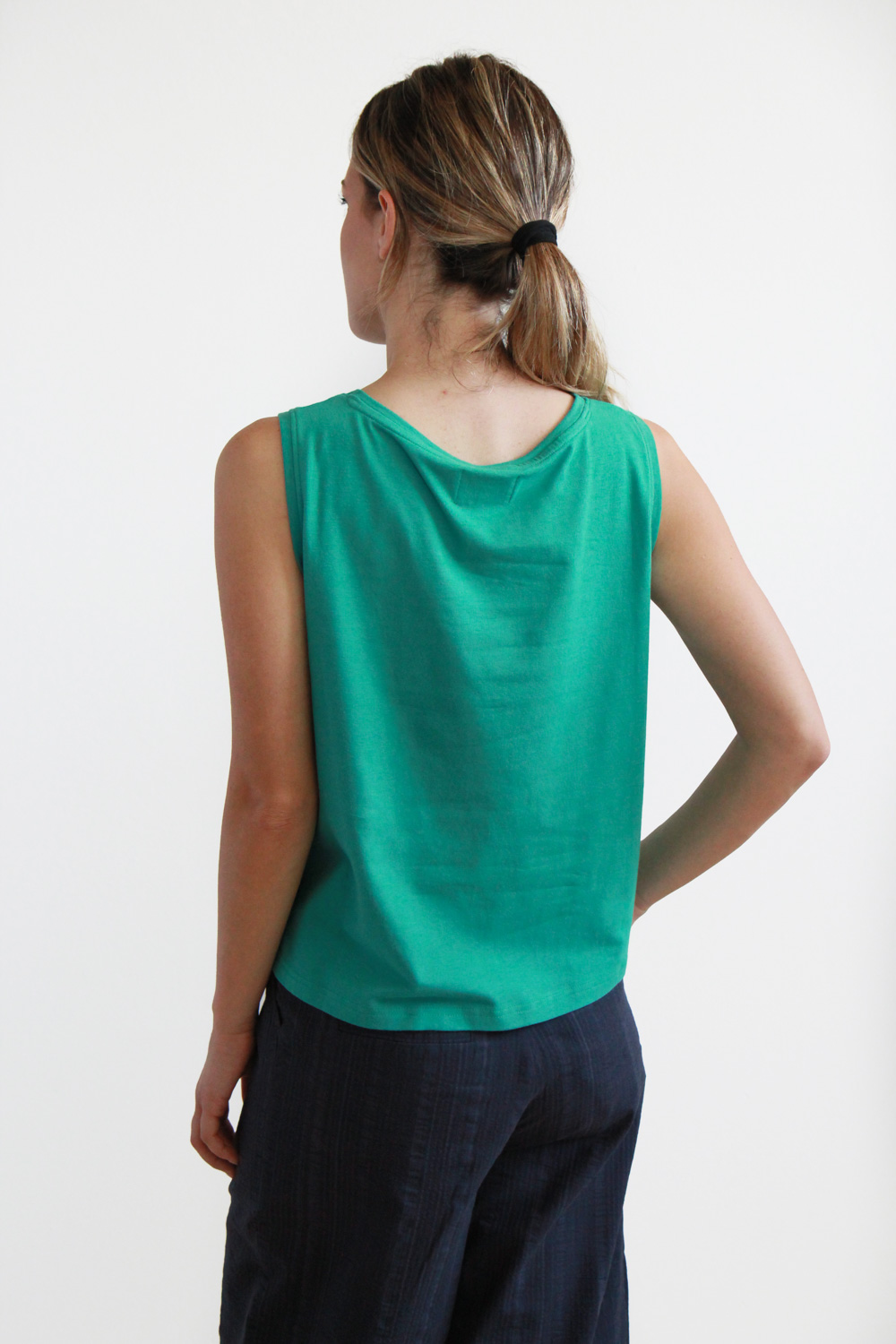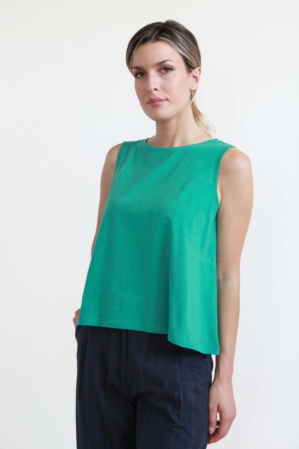Top smanicato in morbido jersey di cotone biologico certificato GOTS elasticizzato. Modello caratterizzato da uno scollo a giro e da una linea svasata.